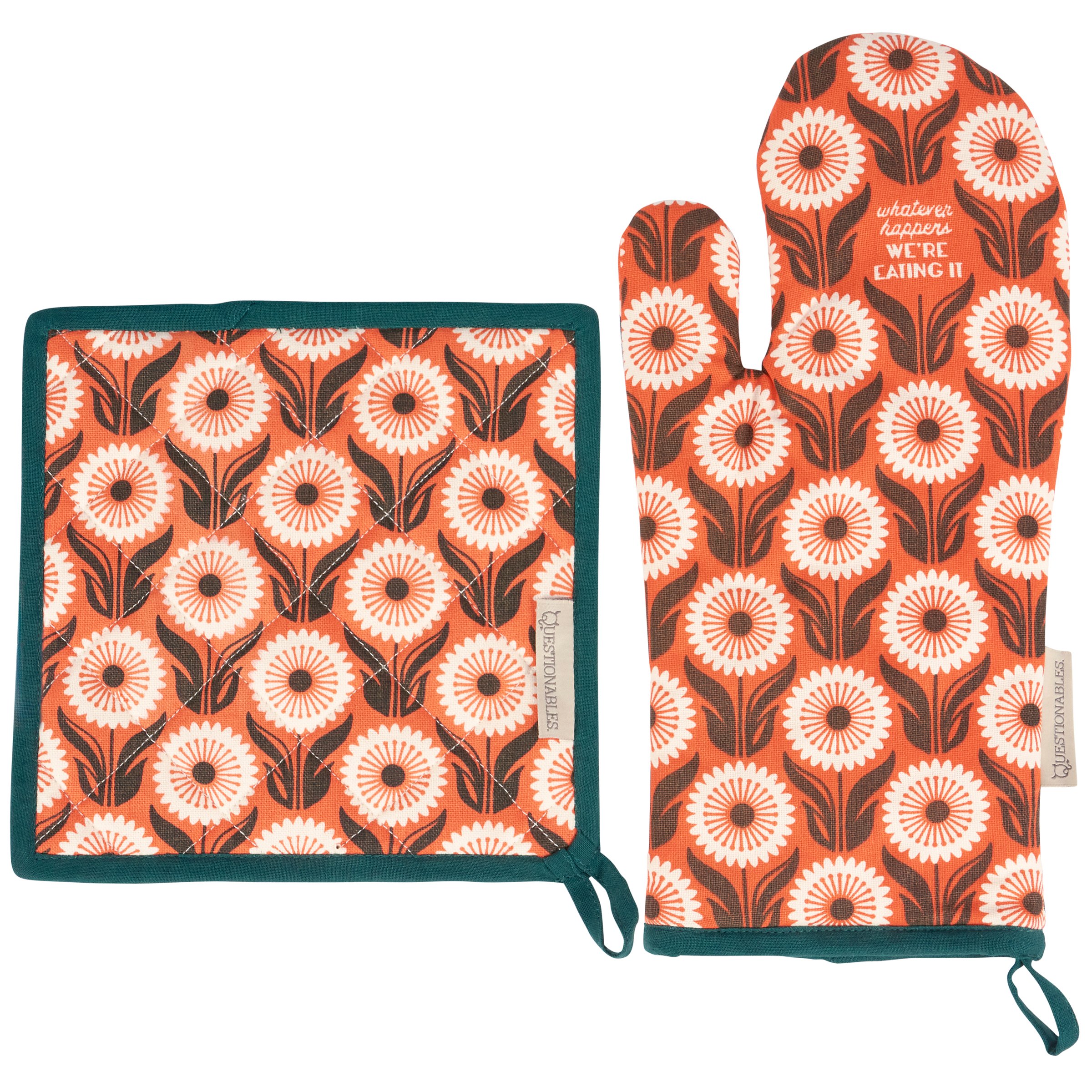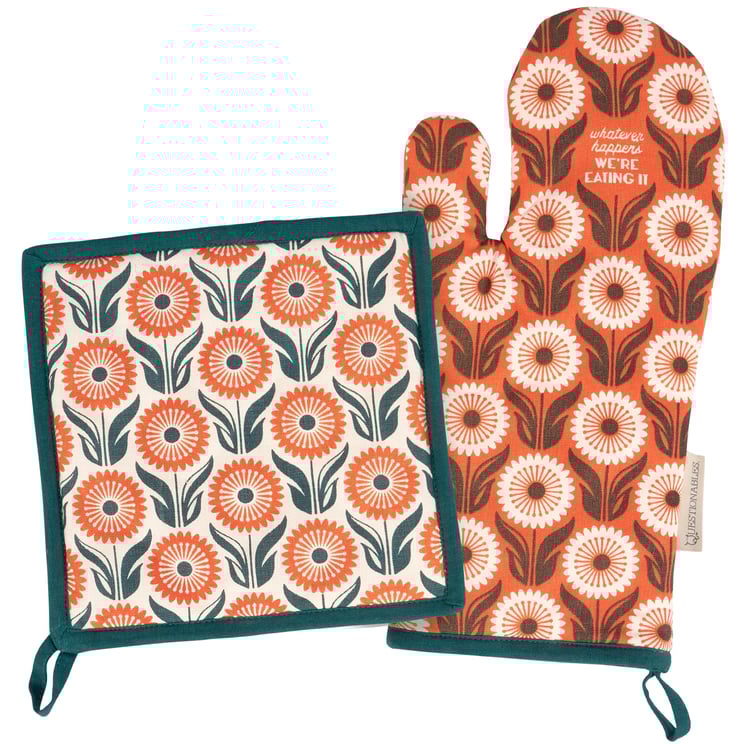 This sassy kitchen set includes an oven mitt and matching potholder featuring coordinating floral patterns in a bold color palette. Oven mitt displays "Whatever Happens We're Eating It" to let others know if they don't like the food, they can cook next time. Questionables kitchen sets are machine-washable for stress-free cleaning after making a mess in the kitchen. Each item includes a loop for hanging. Our Whatever Happens kitchen set demands attention and lets everyone know that everyday life can be hard, but you got this.