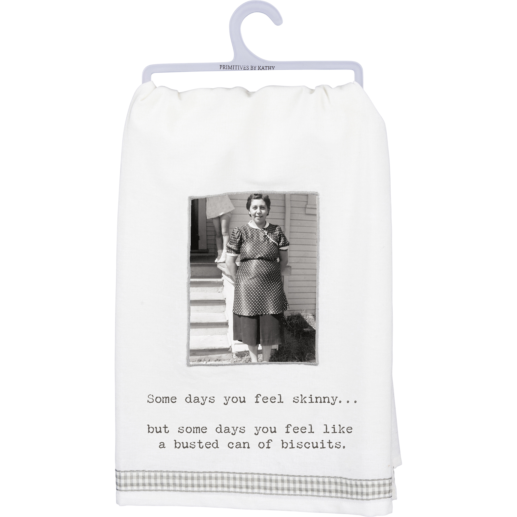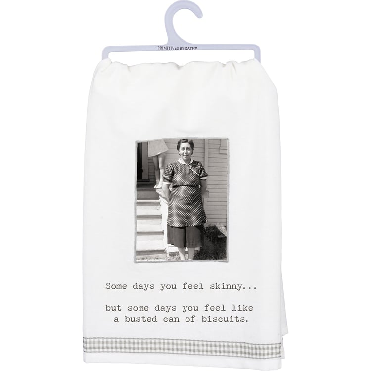 A cotton kitchen towel lending a "Some Days You Feel Skinny… But Some Days You Feel Like A Busted Can Of Biscuits." sentiment and featuring vintage photography, panel stitched accents, and gingham trim. Complements well with coordinating design pieces for a humorous kitchen décor collection.