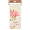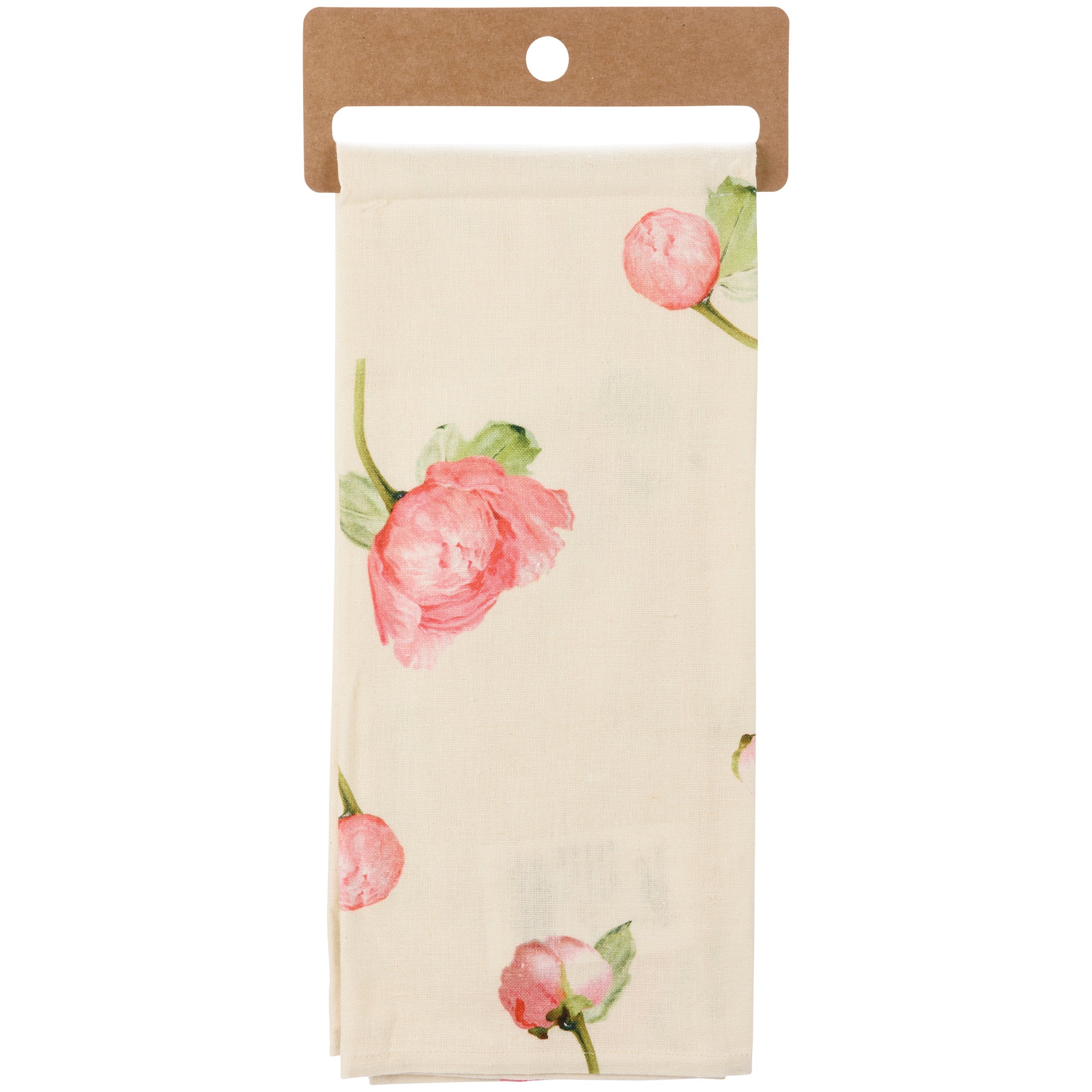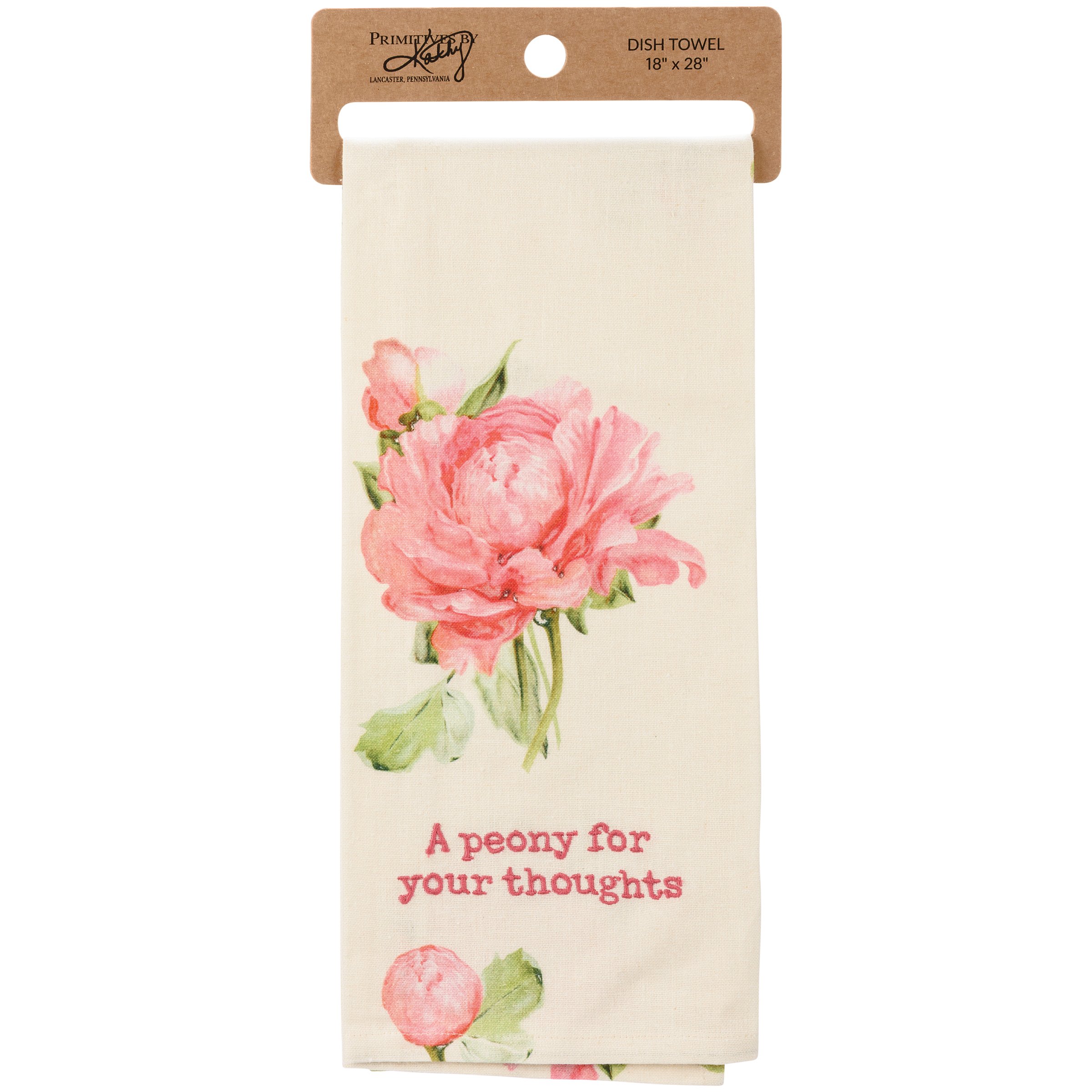 A cotton linen blend kitchen towel from our Garden Collection featuring all-over vintage style peony designs and punny embroidered "A Peony For Your Thoughts" sentiment. Features a cotton tape loop in the corner for easy hanging. Machine-washable. Towel is packaged on a cardboard hanger with a hole to easily hang on rack.
