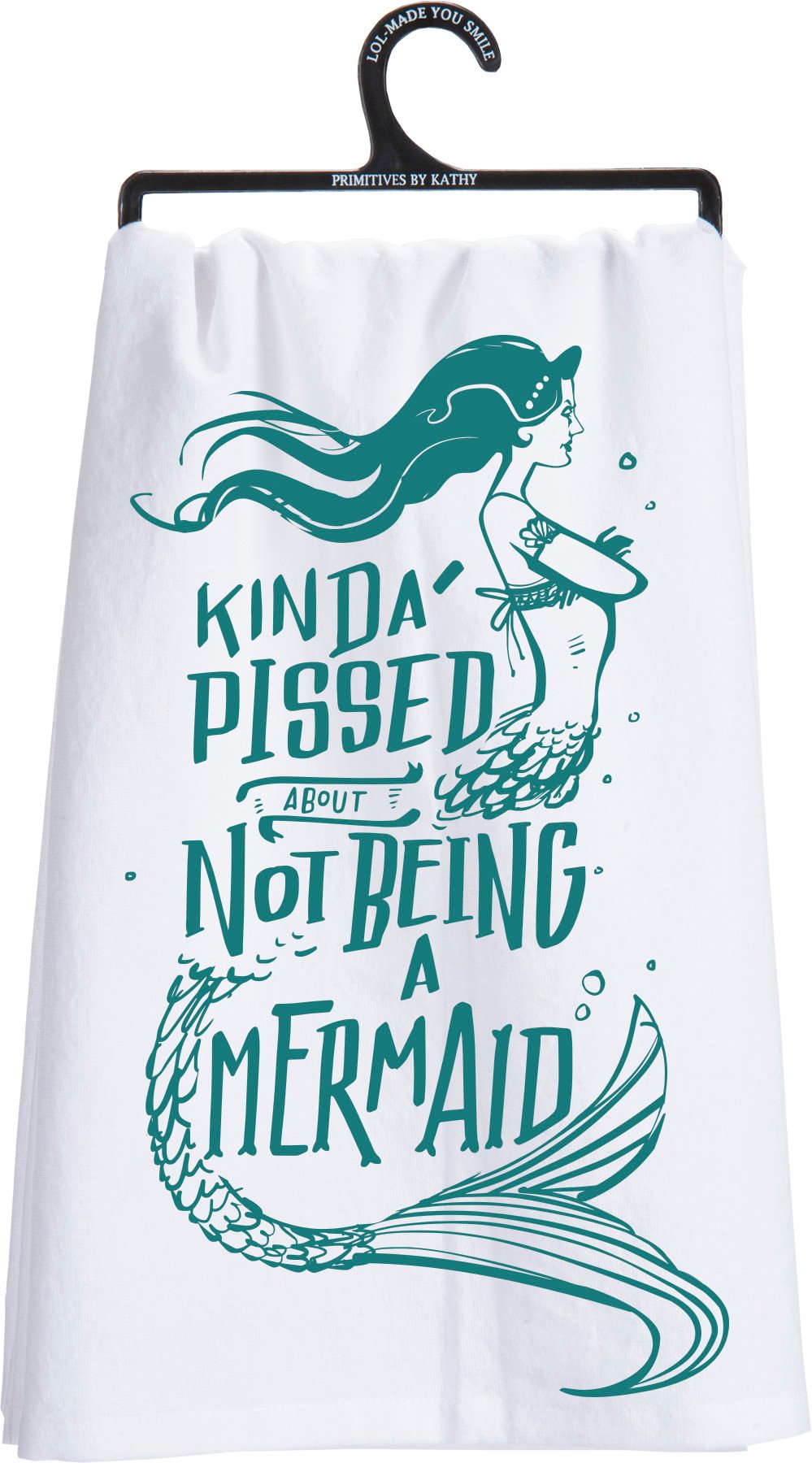 A blue and white cotton kitchen towel lending a hand lettered "Kinda Pissed About Not Being A Mermaid" sentiment with mermaid design that complements well with existing kitchen decor. Machine-washable.