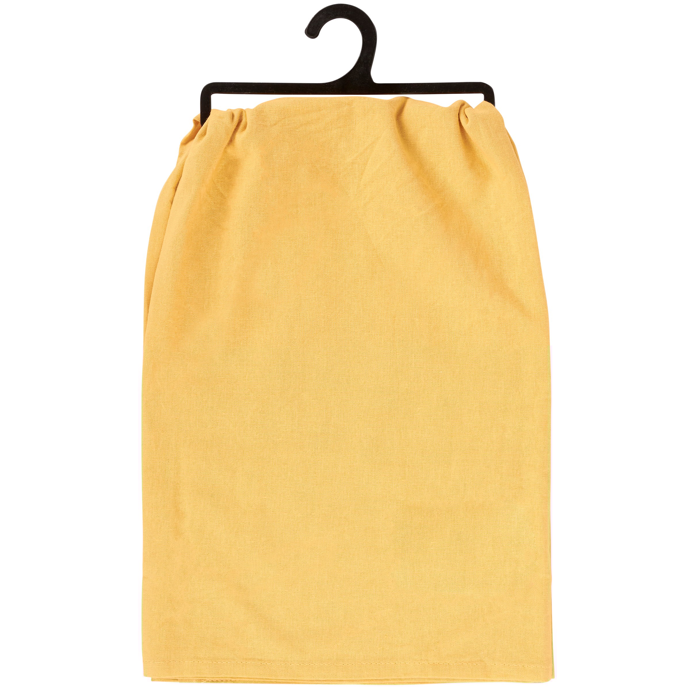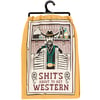 A golden yellow cotton kitchen towel from our Western Collection displaying a design of a cowboy opening saloon doors in a playful hand illustrated style with a fun western-themed sentiment that reads "Shit's About To Get Western." Our About To Get Western kitchen towel is conveniently machine-washable for easy cleaning. Western kitchen towel is packaged on a black plastic hanger to easily display on rack. A fun western kitchen accessory perfect for everyday use.
