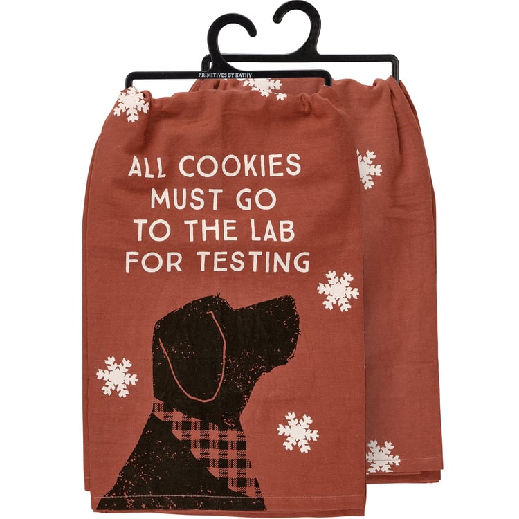 A red cotton kitchen towel from our Holiday Pet Collection displaying a rustic design of a dog wearing a bandana with a humorous pet-themed sentiment that reads "All Cookies Must Go To The Lab For Testing." Our All Cookies kitchen towel is conveniently machine-washable for easy cleaning. Seasonal kitchen towel is packaged on a black plastic hanger to easily display on rack. A fun pet-themed kitchen accessory perfect for seasonal use.
