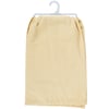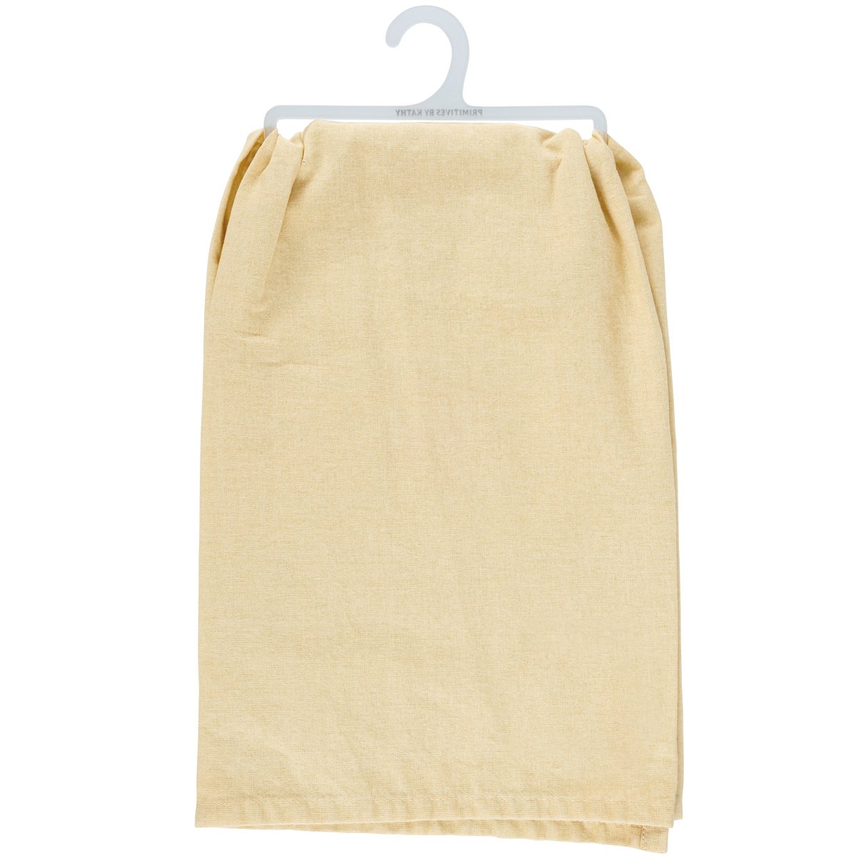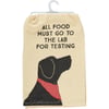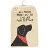 A tan cotton kitchen towel from our Pet Collection displaying a rustic design of a dog wearing a red bandana with a humorous sentiment that reads "All Food Must Go To The Lab For Testing." Our All Food To The Lab kitchen towel is machine-washable for convenient cleaning. Packaged on a clear plastic hanger to easily display on rack. A charming and functional everyday kitchen accent.