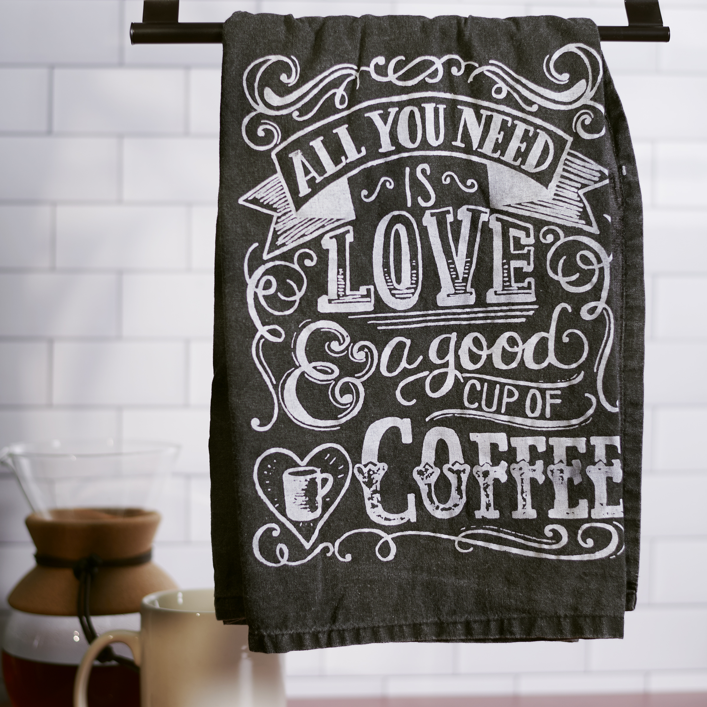 A black and white cotton kitchen towel featuring unique chalk art, hand lettered "All You Need Is Love & A Good Cup Of Coffee" sentiment, and mug, heart, and swirled line designs. Complements well with existing decor or coordinating design pieces. Machine-washable.
