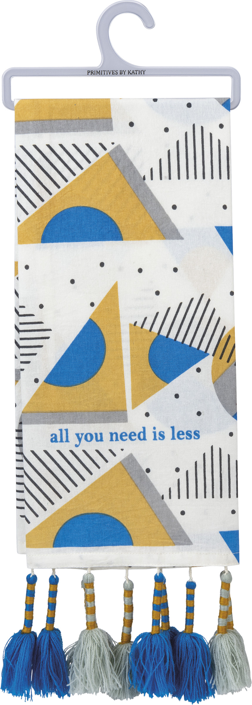 A 1980s Memphis-inspired cotton kitchen towel featuring geometric designs throughout, subtle "All You Need Is Less" sentiment, and asymmetrical multicolored tassel trim. Machine-washable. Complements well with other coordinating Memphis style collection pieces.