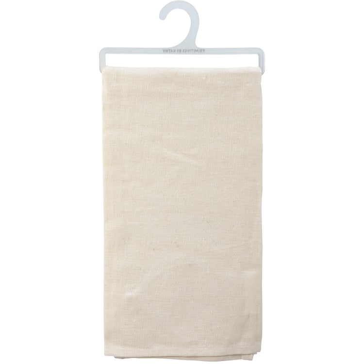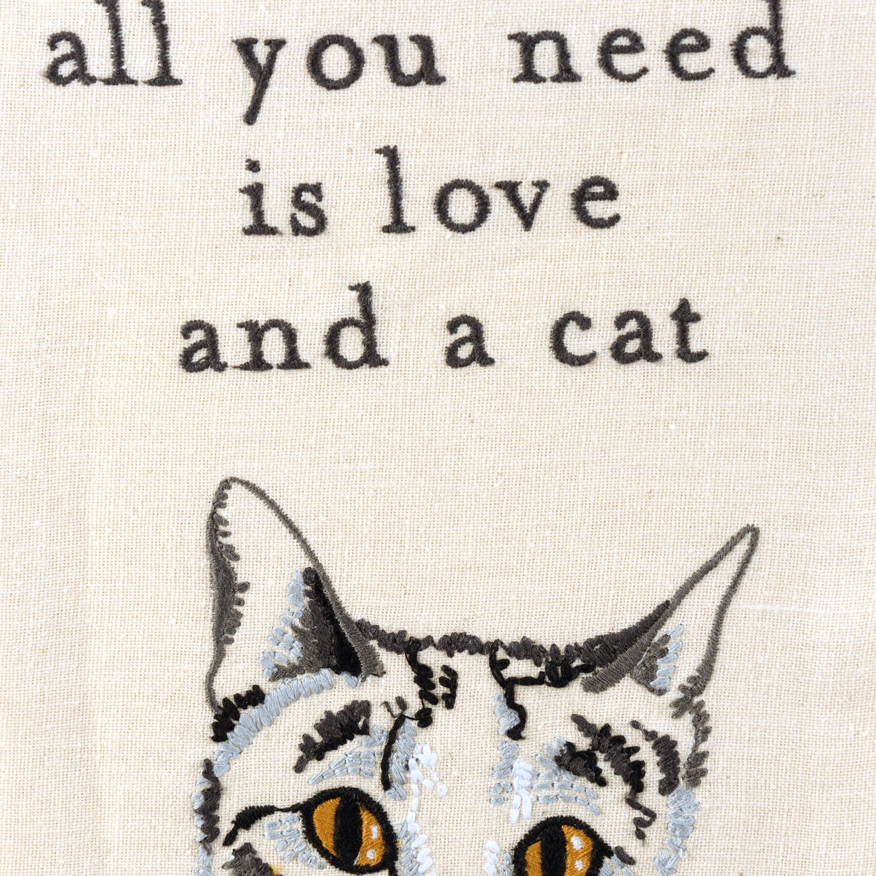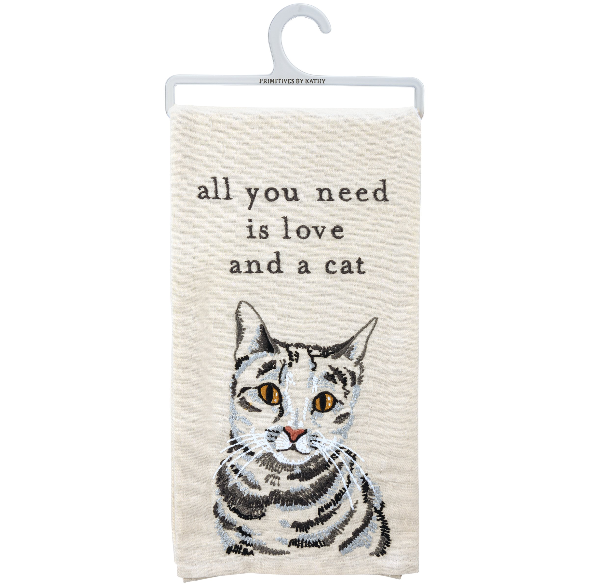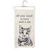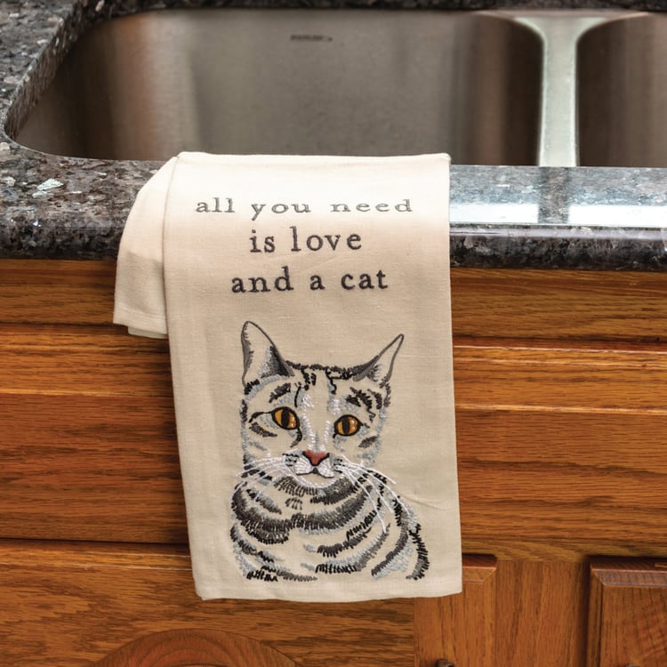 A cotton linen blend kitchen towel featuring a stitched art panel with embroidered "All You Need Is Love And A Cat" sentiment and cat design. Our All You Need Is Love And A Cat kitchen towel is machine-washable.