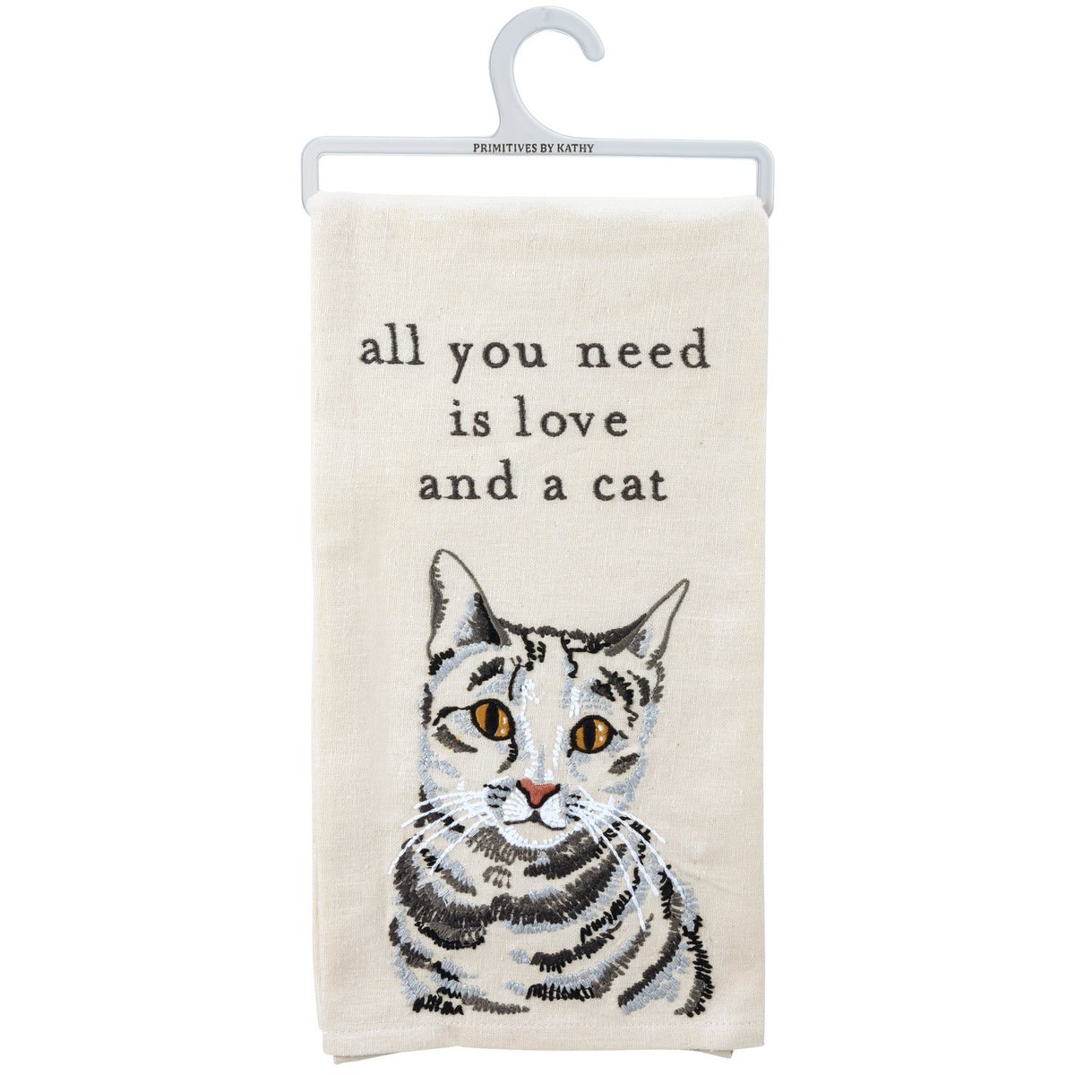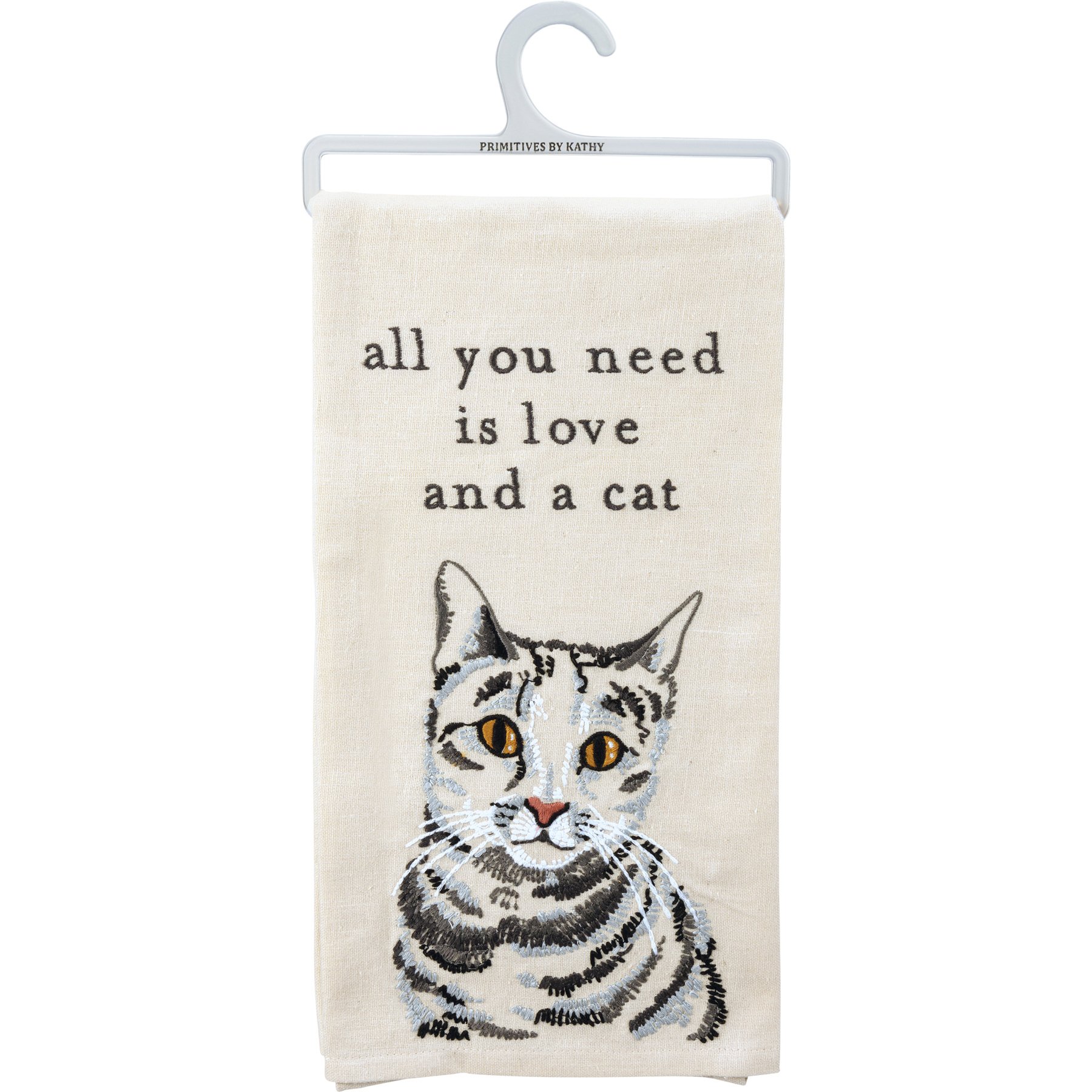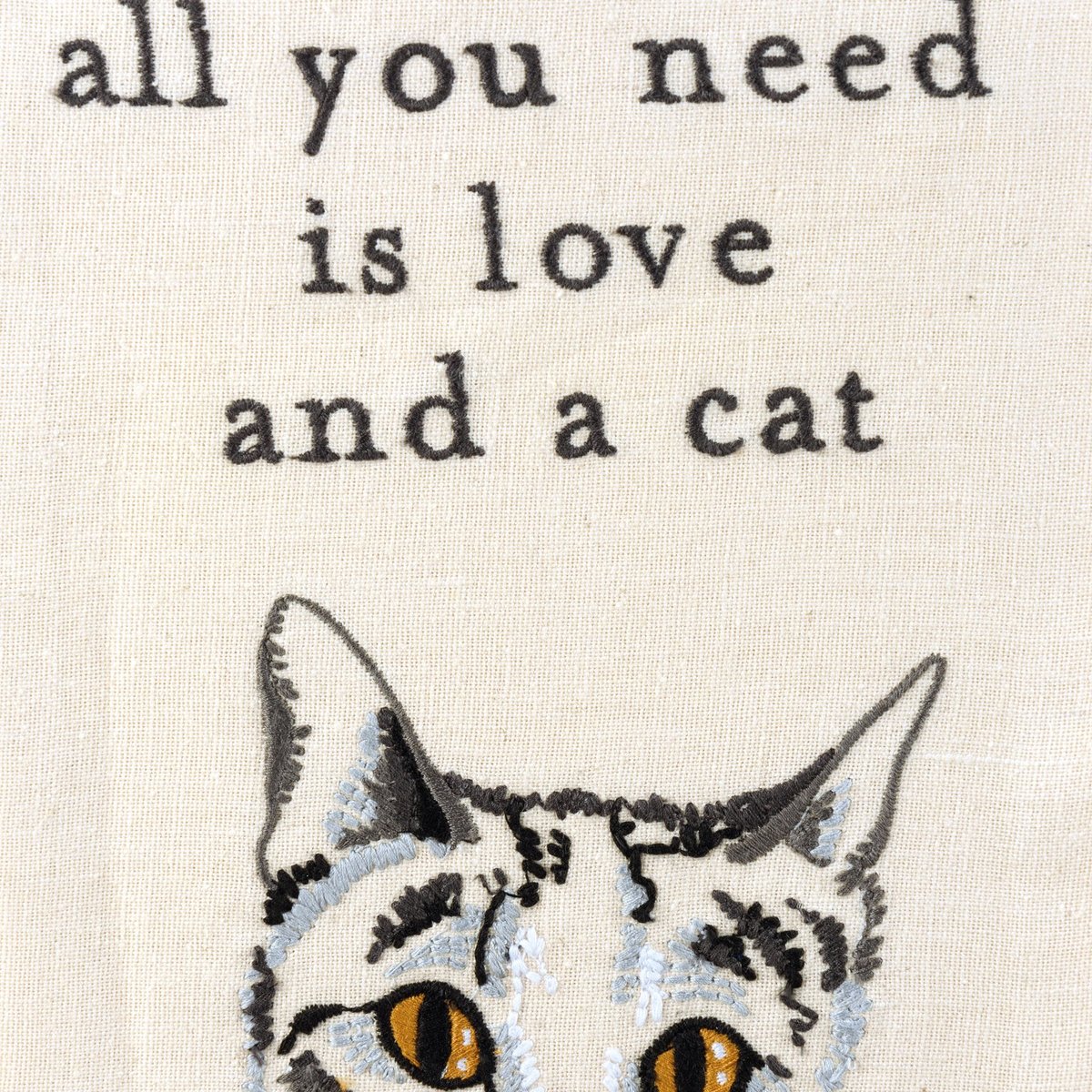 A cotton linen blend kitchen towel featuring a stitched art panel with embroidered "All You Need Is Love And A Cat" sentiment and cat design. Our All You Need Is Love And A Cat kitchen towel is machine-washable.
