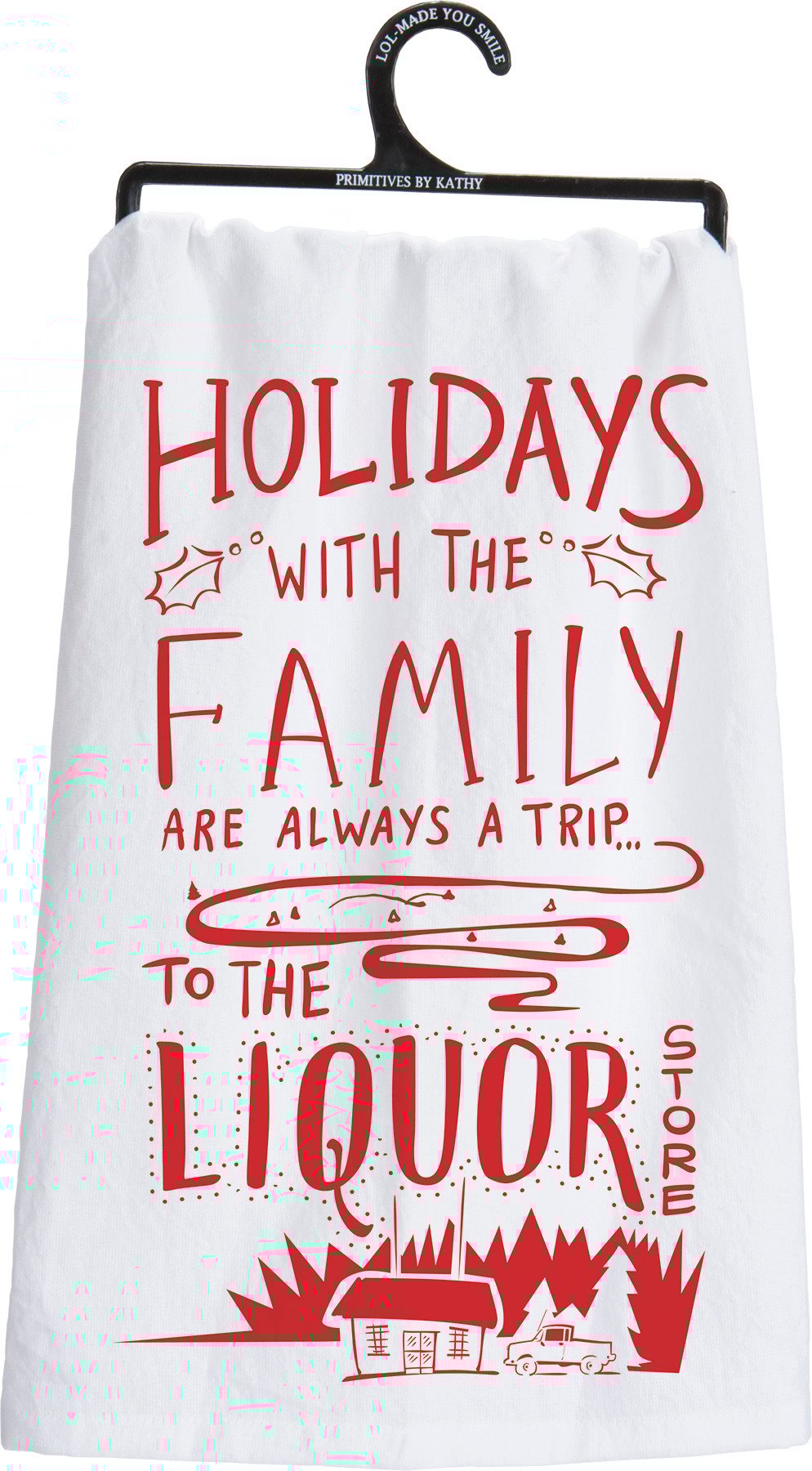 A red and white cotton kitchen towel lending a hand lettered "Holidays With The Family Are Always A Trip… To The Liquor Store" sentiment with holly, store, and road designs. Complements well with existing kitchen decor; machine-washable.