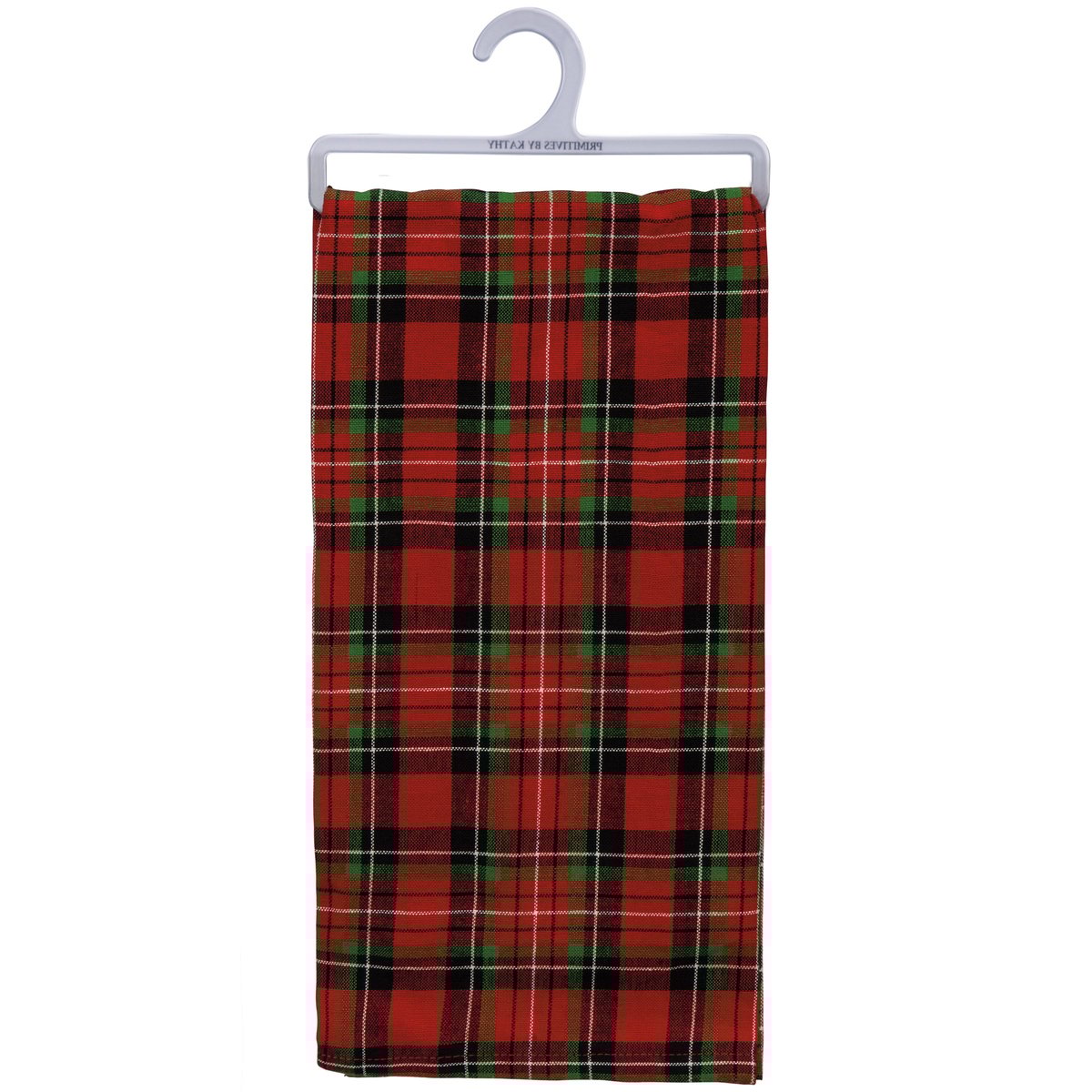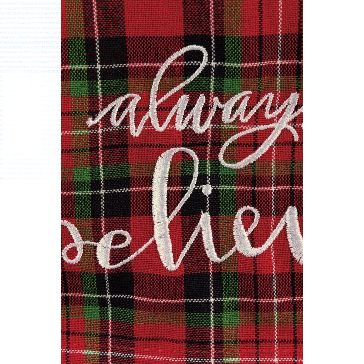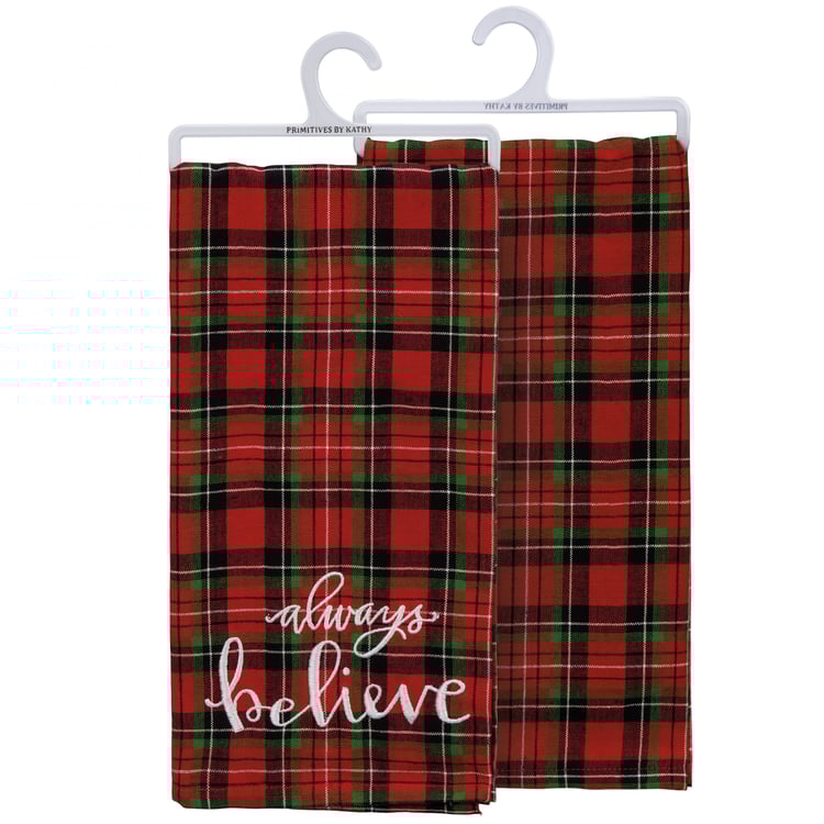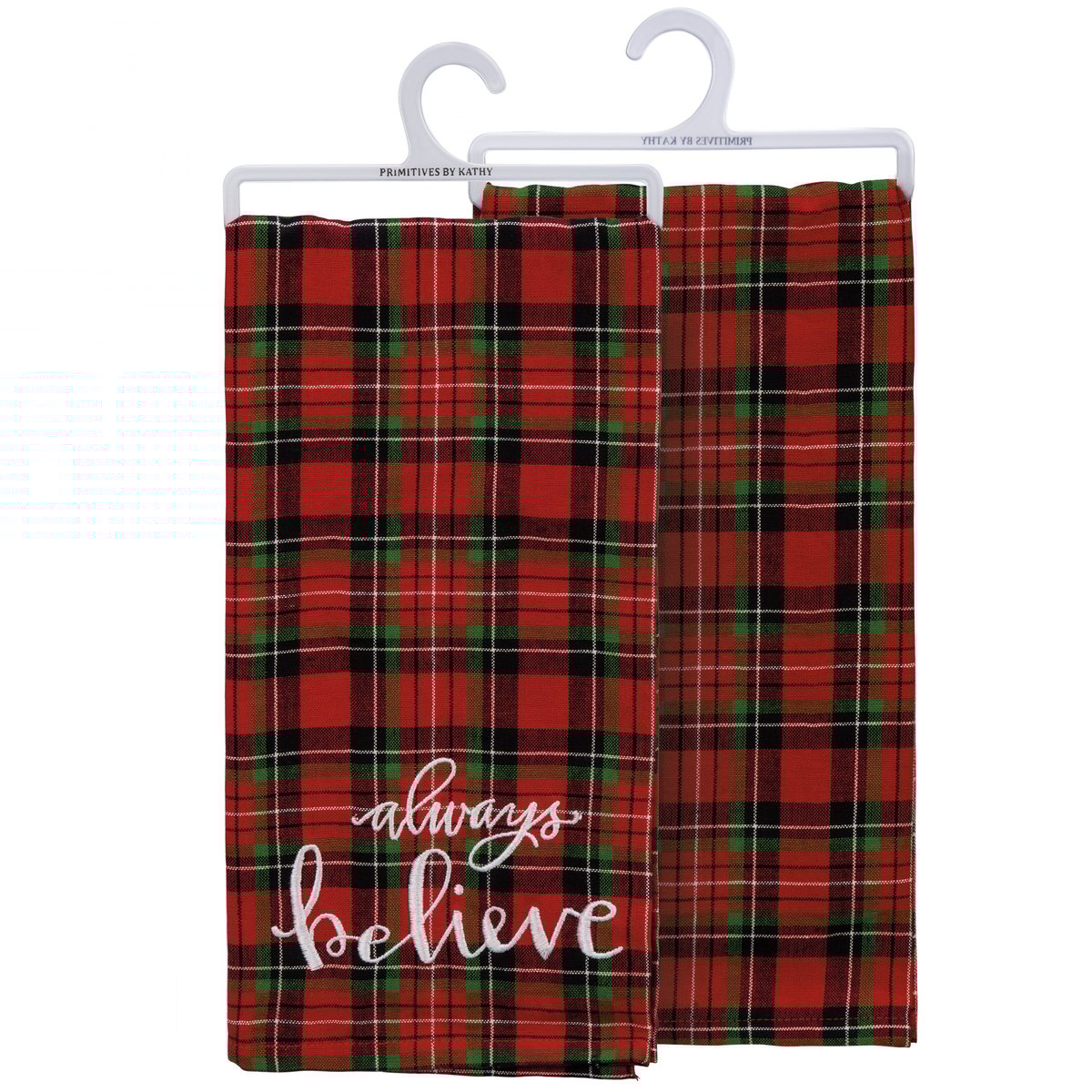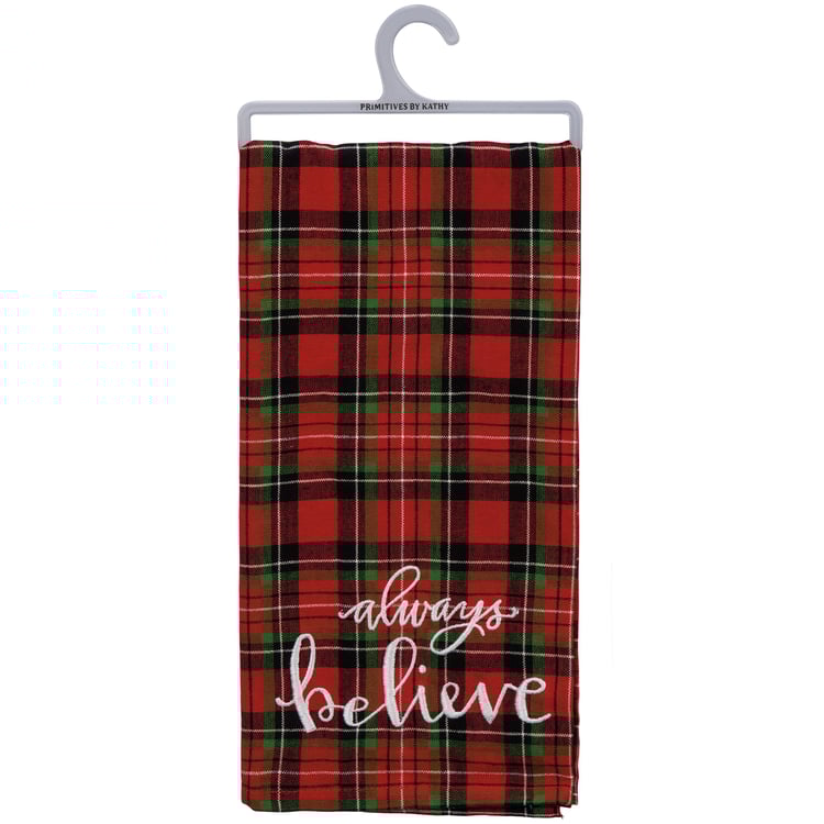 A cotton kitchen towel featuring an all-over Christmas plaid pattern with an embroidered, hand lettered "Always Believe" sentiment. Machine-washable.
