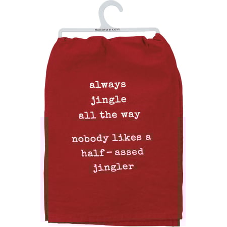 A cotton kitchen towel featuring typeset "Always Jingle All The Way - Nobody Likes A Half-Assed Jingler" sentiment in a holiday neutral palette. Machine-washable.
