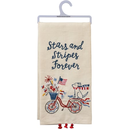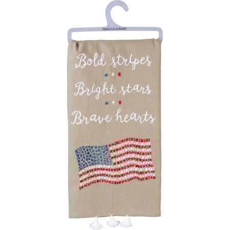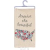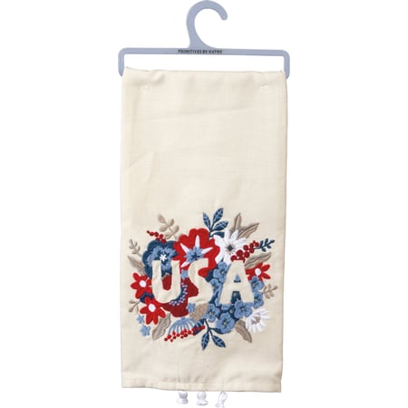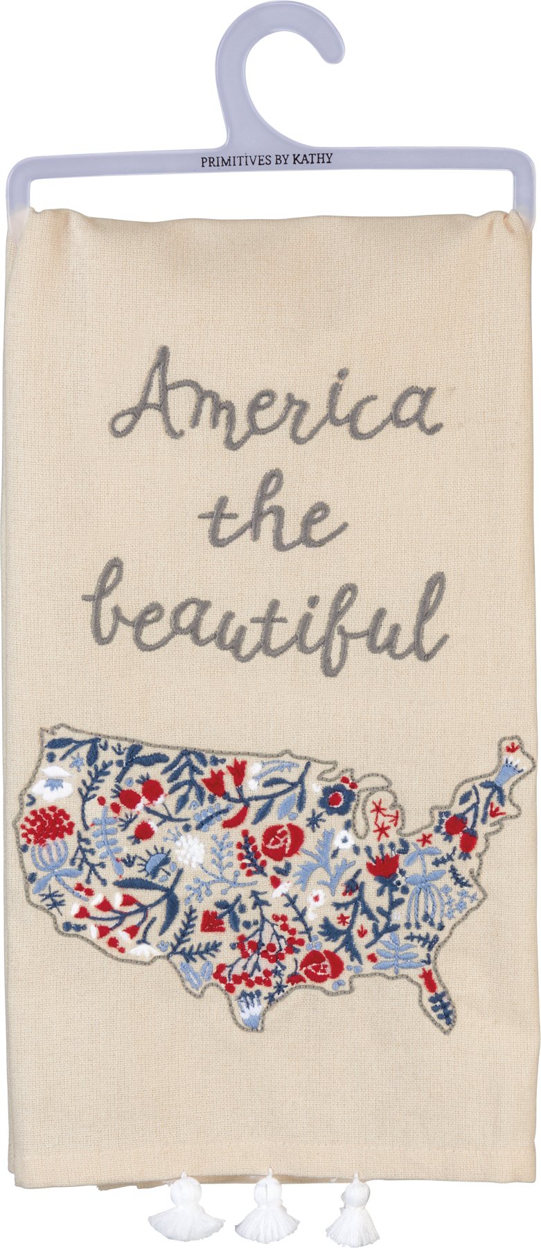 Charming as it is patriotic, this linen blend kitchen towel features an embroidered "America The Beautiful" sentiment, floral-filled country design, and tassel trim details. Complements well with coordinating styles for a cohesive collection. Machine-washable.