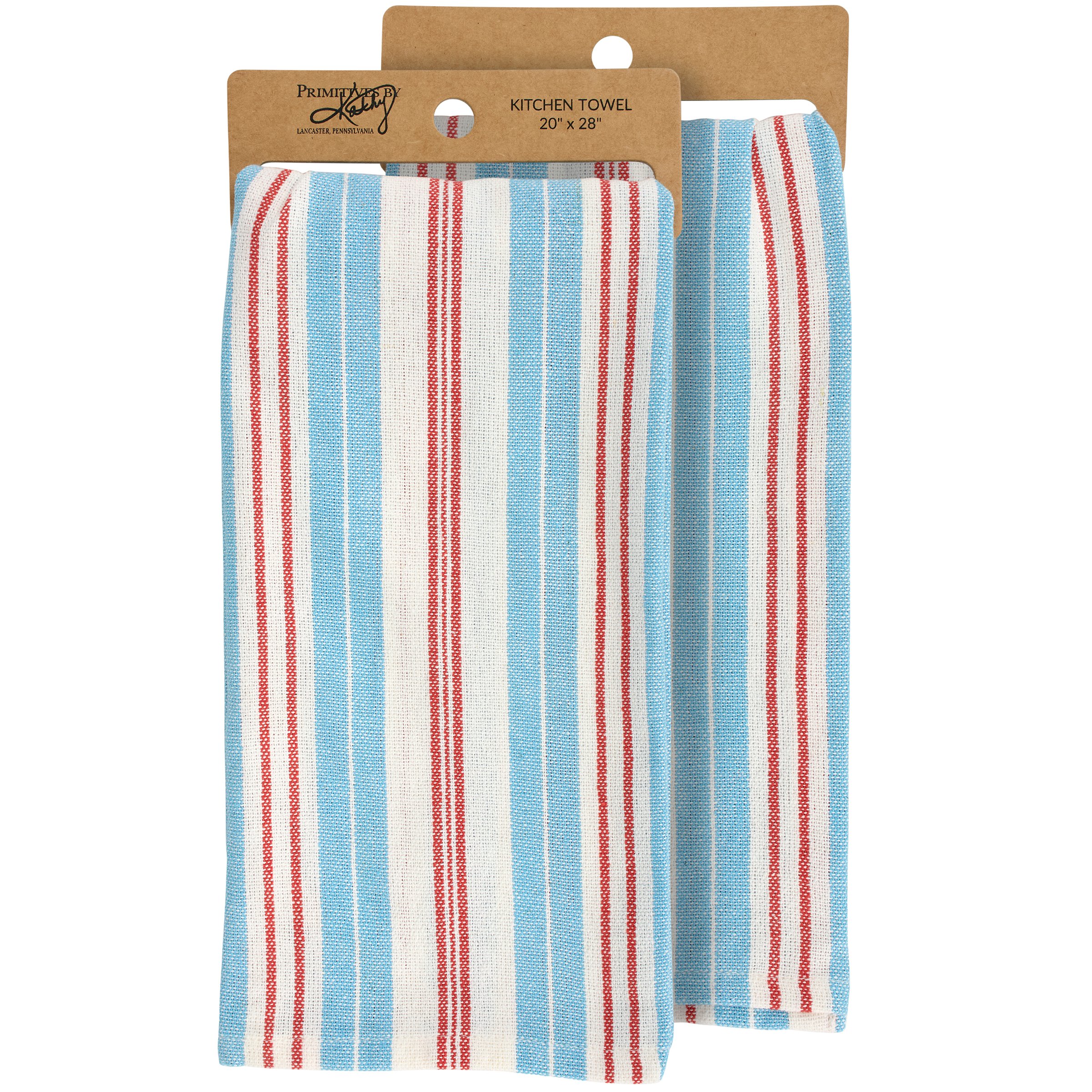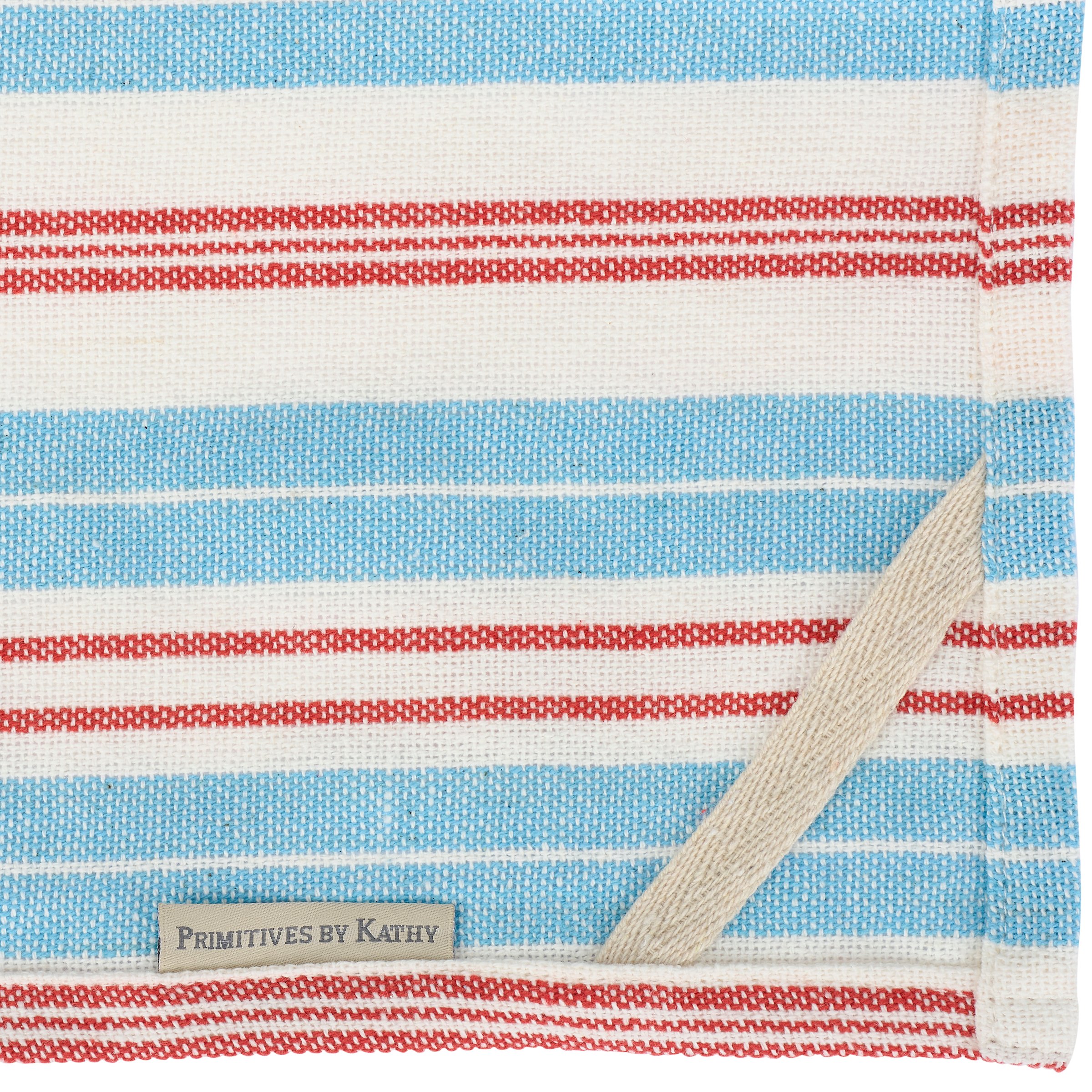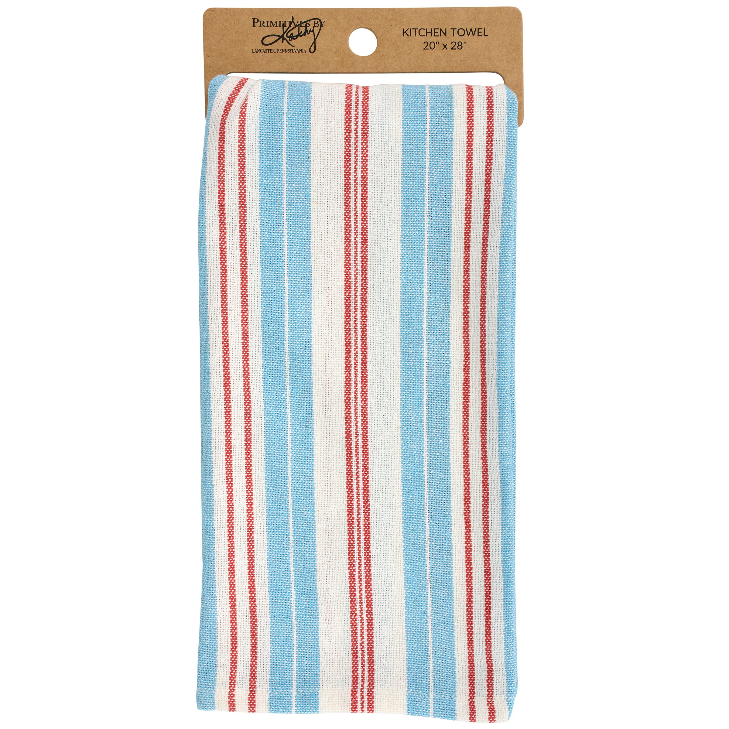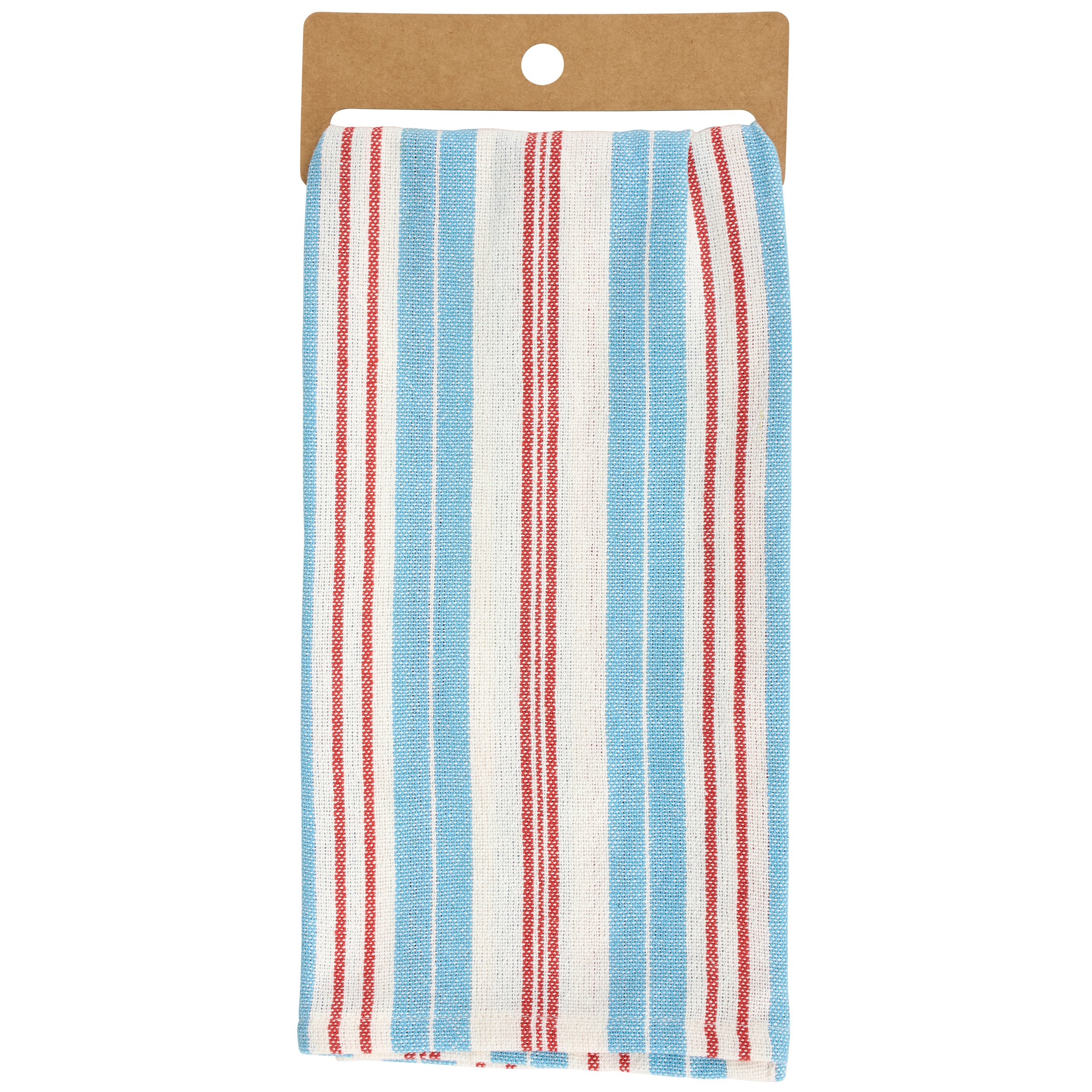 A cotton kitchen towel from our Patriotic Collection displaying an all-over design of woven red, white, and blue stripes inspired by Americana home decor. Our Americana Stripe kitchen towel is conveniently machine-washable for easy cleaning. Americana kitchen towel is packaged on a cardboard hanger with hole to easily display on rack. A patriotic kitchen accessory perfect for 4th of July and Memorial Day decorating or celebrating stars and stripes all year round.