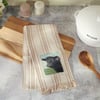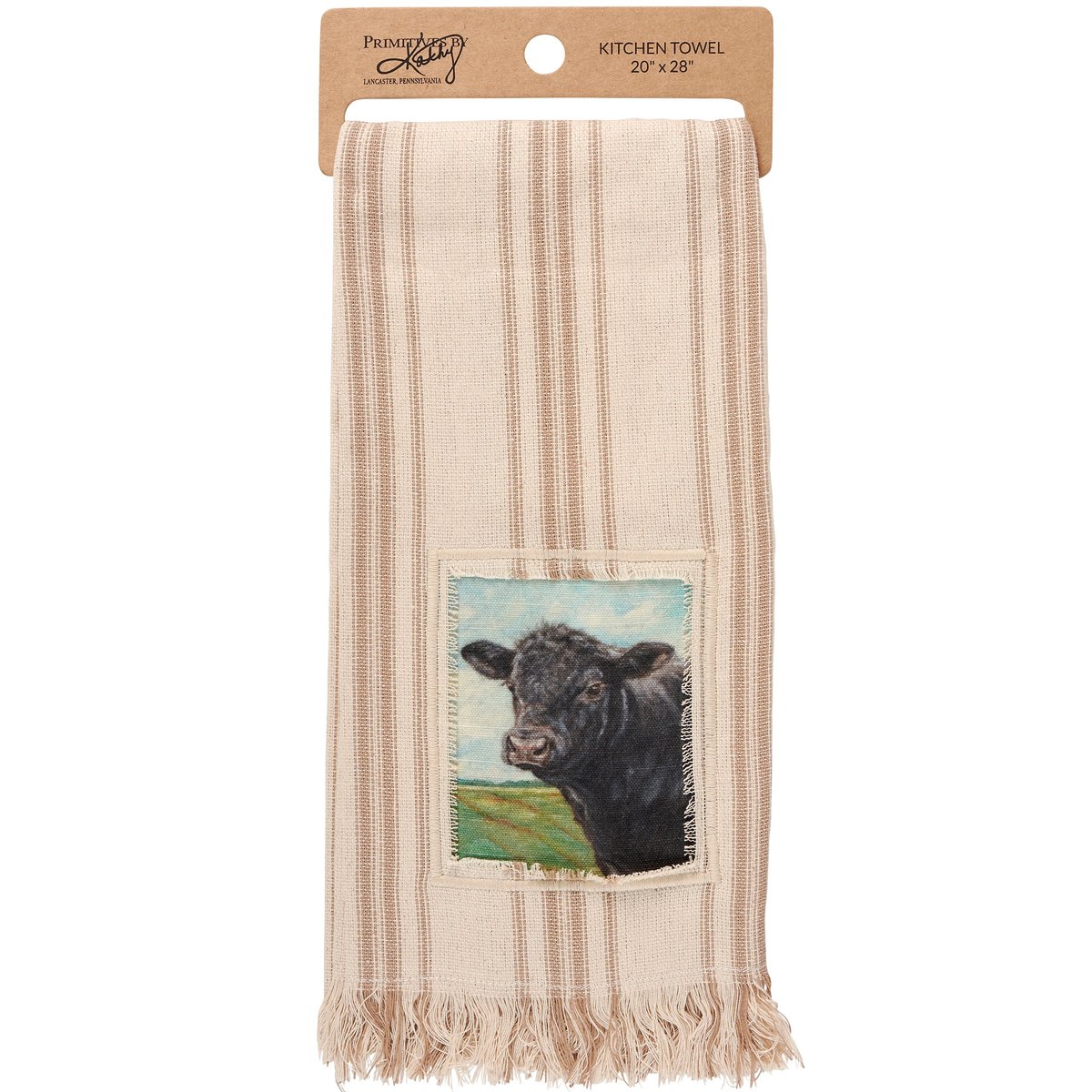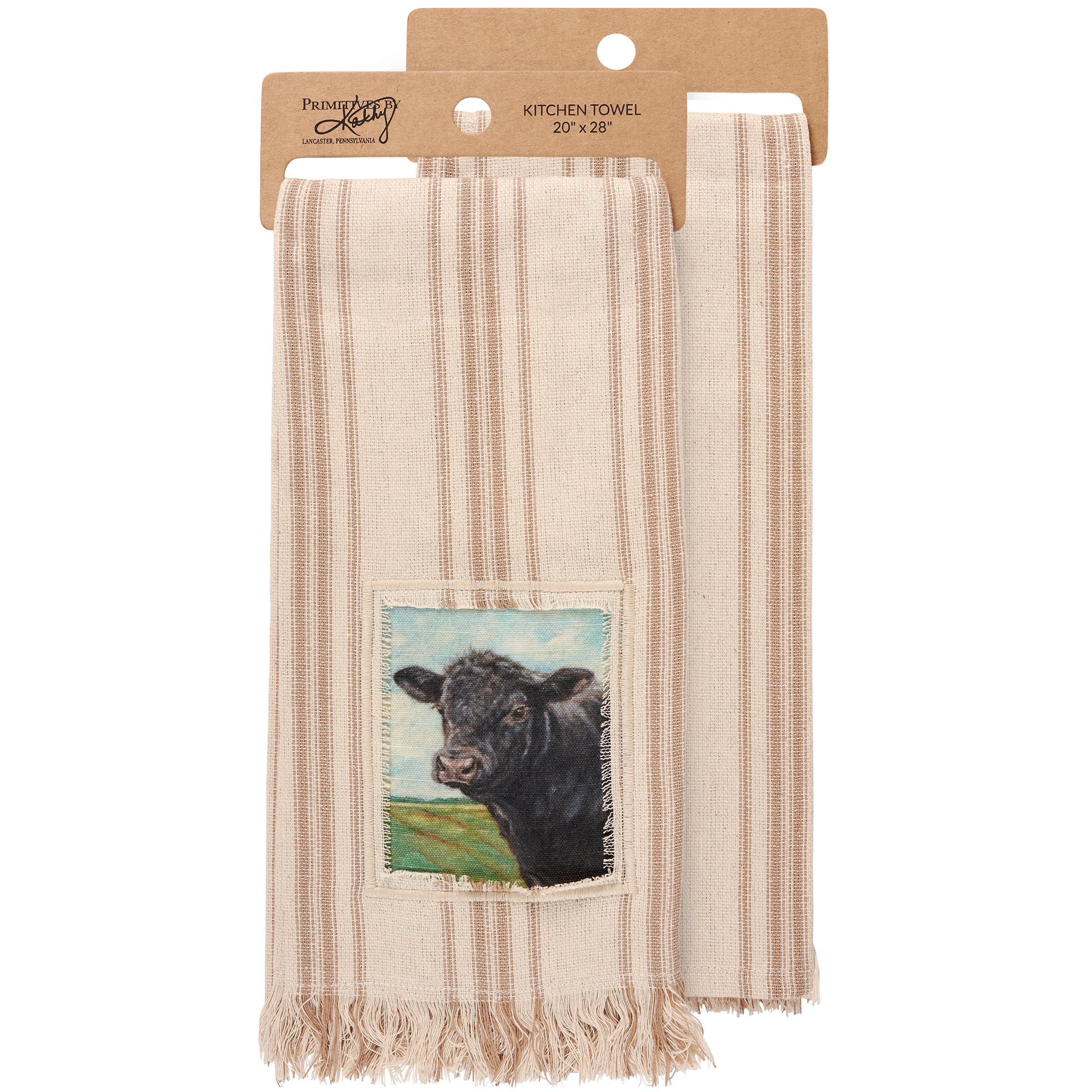 A cream cotton kitchen towel from our Farmhouse Collection featuring a stitched art panel with frayed border and woven brown stripes throughout. Art panel displays an angus cow in a field replicated from original artwork painted onto burlap canvas, giving the art a unique depth and texture. Our Angus Cow kitchen towel is conveniently machine-washable for easy cleaning. Farm towel is packaged on a cardboard hanger with hole to easily display on rack. A rustic farm-themed kitchen accessory perfect for everyday use.
