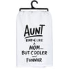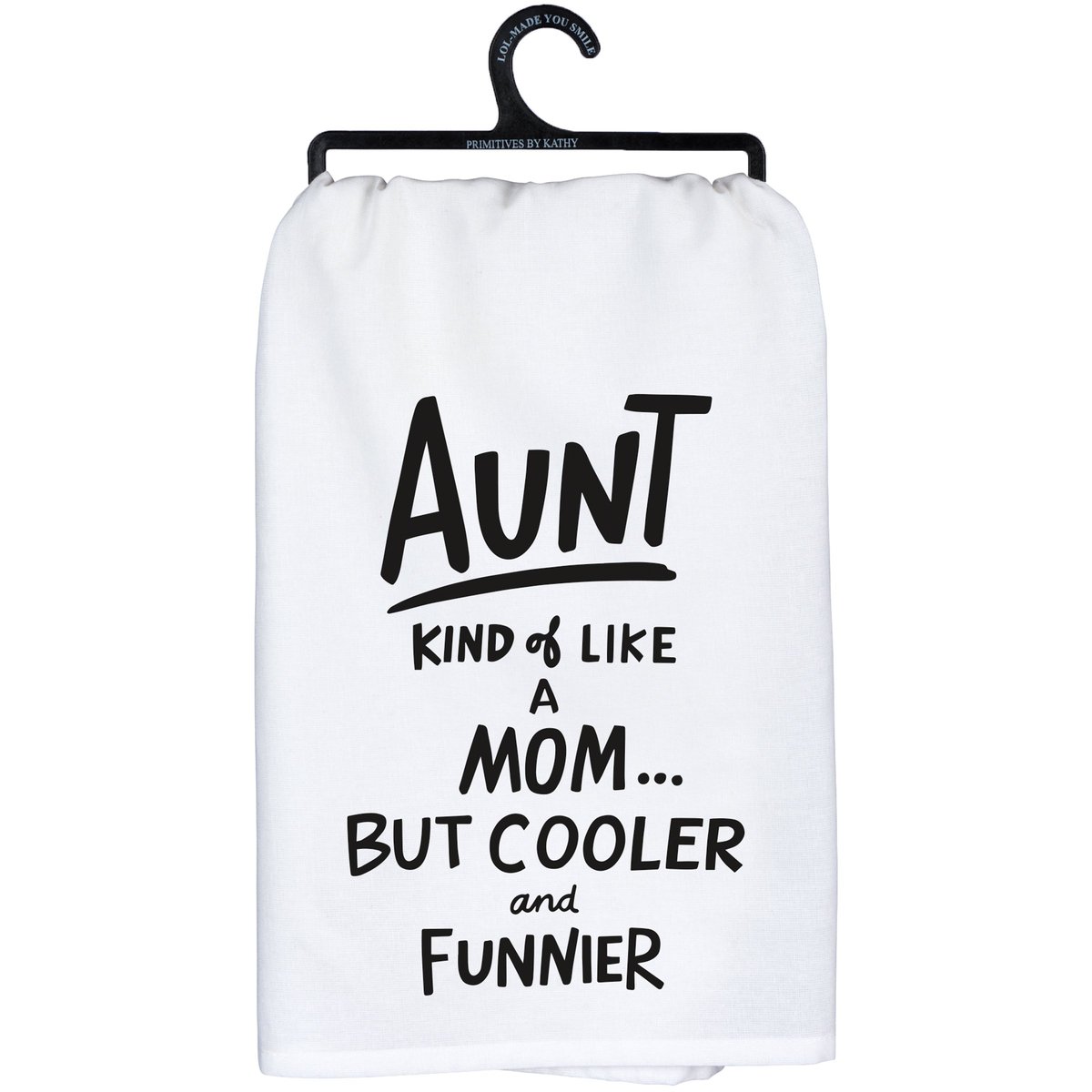 A black and white cotton kitchen towel from our LOL-Made You Smile Collection displaying a fun hand illustrated family-themed sentiment that reads "Aunt - Kind Of Like A Mom... But Cooler And Funnier." Our Aunt Funnier kitchen towel is conveniently machine-washable for easy cleaning. Funny kitchen towel is packaged on a black plastic hanger to easily display on rack. A fun family gift perfect for an everyday kitchen accessory.