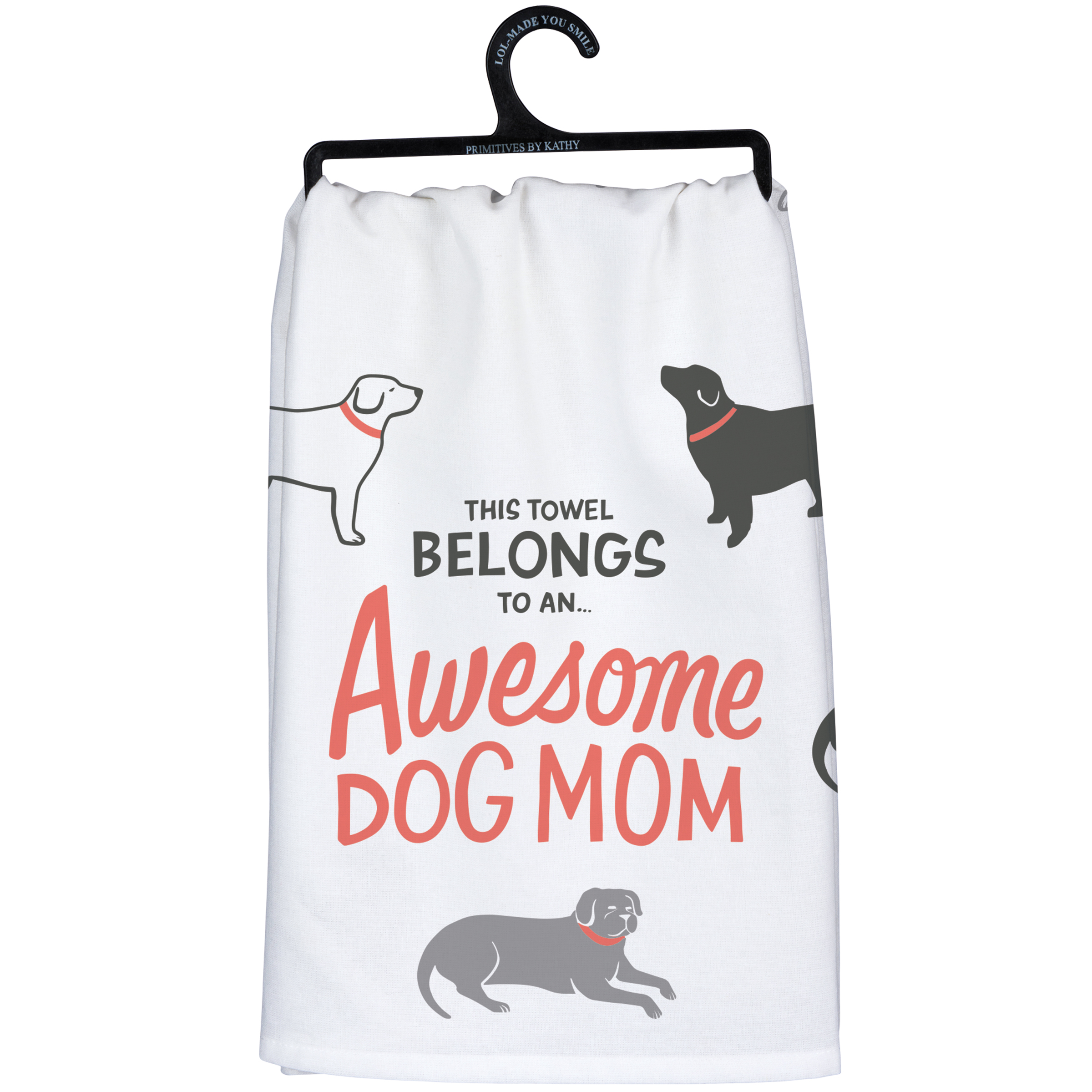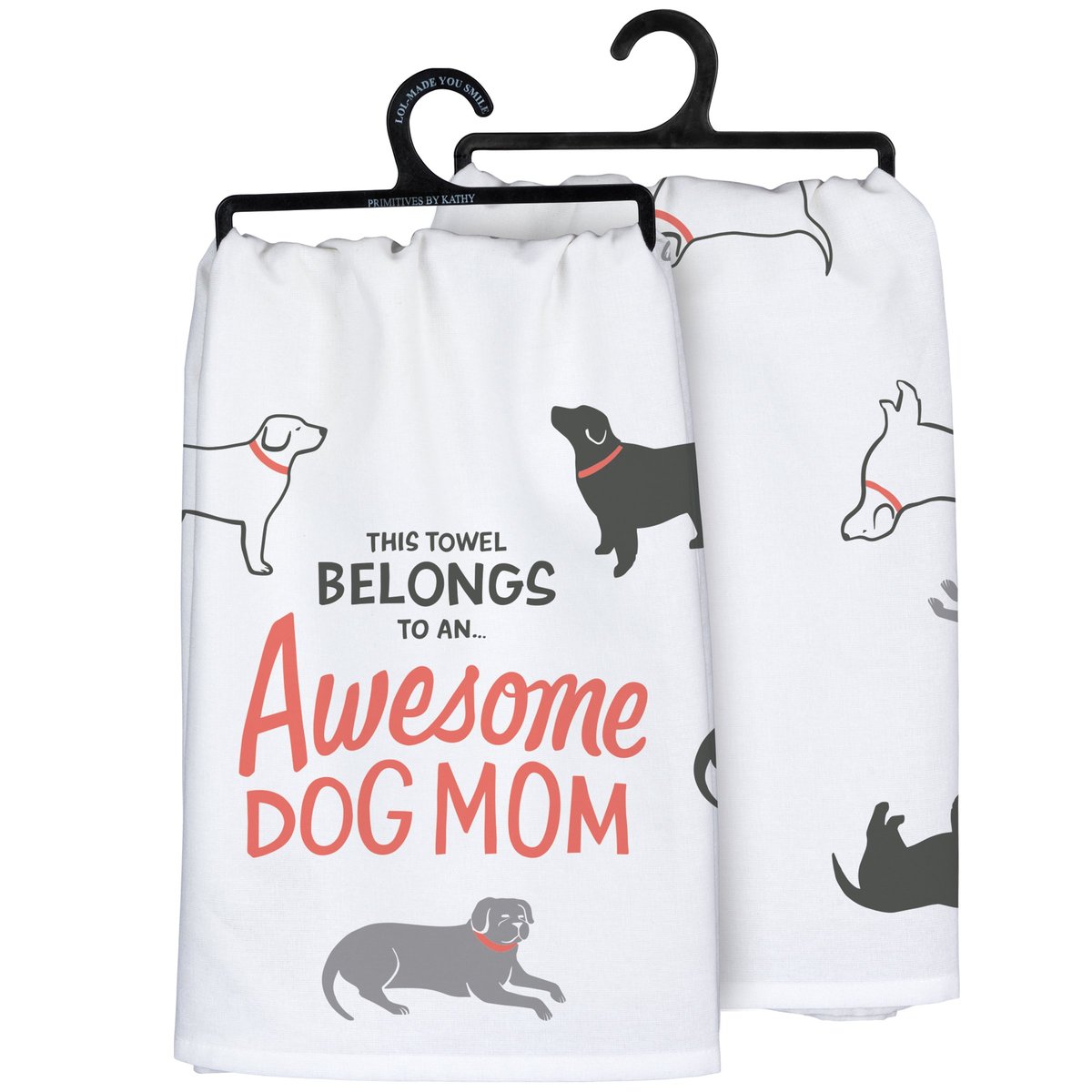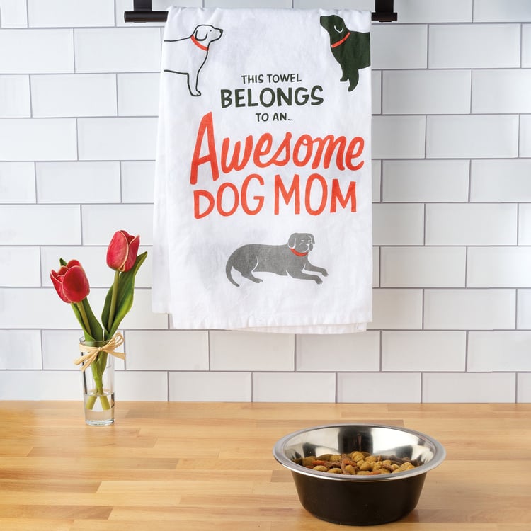 A cotton kitchen towel from our best-selling LOL Made You Smile Collection featuring a "This Towel Belongs To An… Awesome Dog Mom" sentiment with all-over dog designs. Our Awesome Dog Mom kitchen towel is machine-washable.