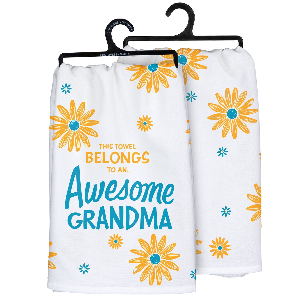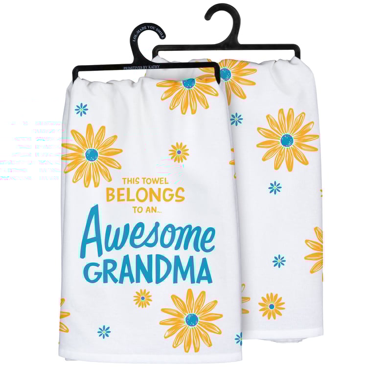 A cotton kitchen towel from our best-selling LOL Made You Smile Collection featuring a "This Towel Belongs To An… Awesome Grandma" sentiment with all-over flower designs. Our Awesome Grandma kitchen towel is machine-washable.
