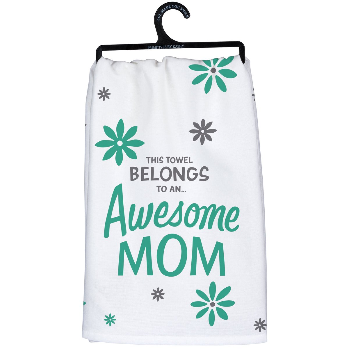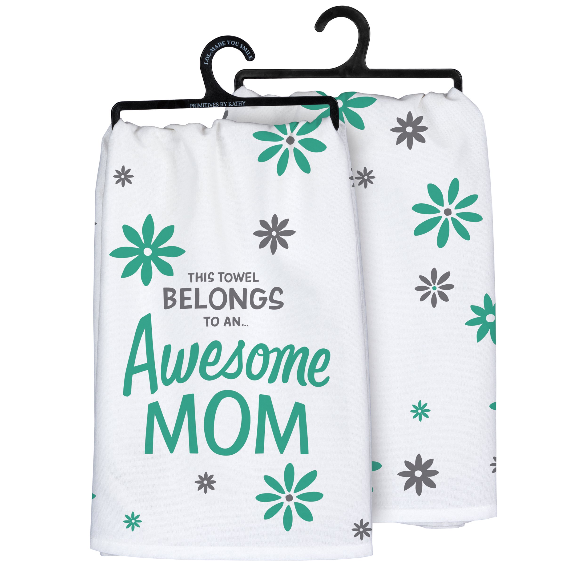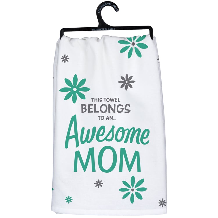 A cotton kitchen towel from our best-selling LOL Made You Smile Collection featuring a "This Towel Belongs To An… Awesome Mom" sentiment with all-over flower designs. Our Awesome Mom kitchen towel is machine-washable.