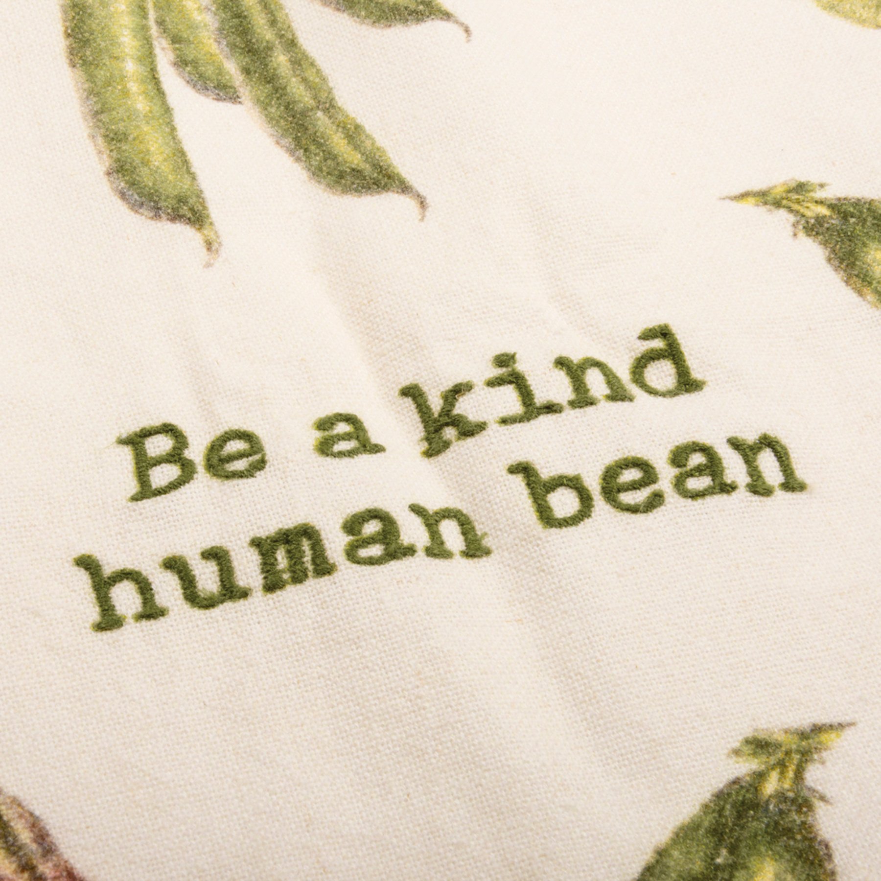 A cotton linen blend kitchen towel featuring all-over retro style bean pod designs and punny embroidered "Be A Kind Human Bean" sentiment. Features a cotton tape loop in the corner for easy hanging. Machine-washable. Towel is packaged on a cardboard hanger with a hole to easily hang on rack.
