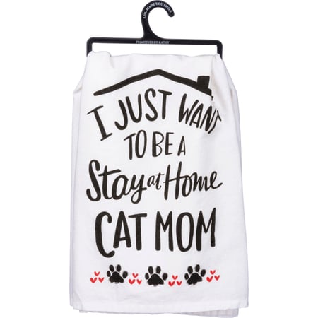 A cotton kitchen towel lending an "I Just Want To Be A Stay At Home Cat Mom" sentiment with rooftop, paw print, and heart designs. Machine-washable.