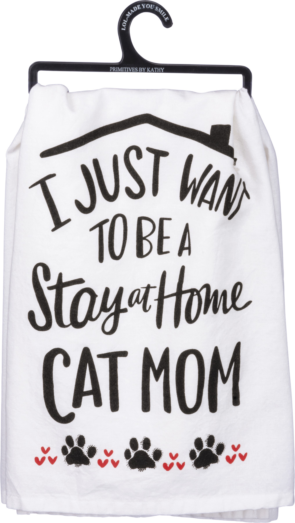 A cotton kitchen towel lending an "I Just Want To Be A Stay At Home Cat Mom" sentiment with rooftop, paw print, and heart designs. Machine-washable.