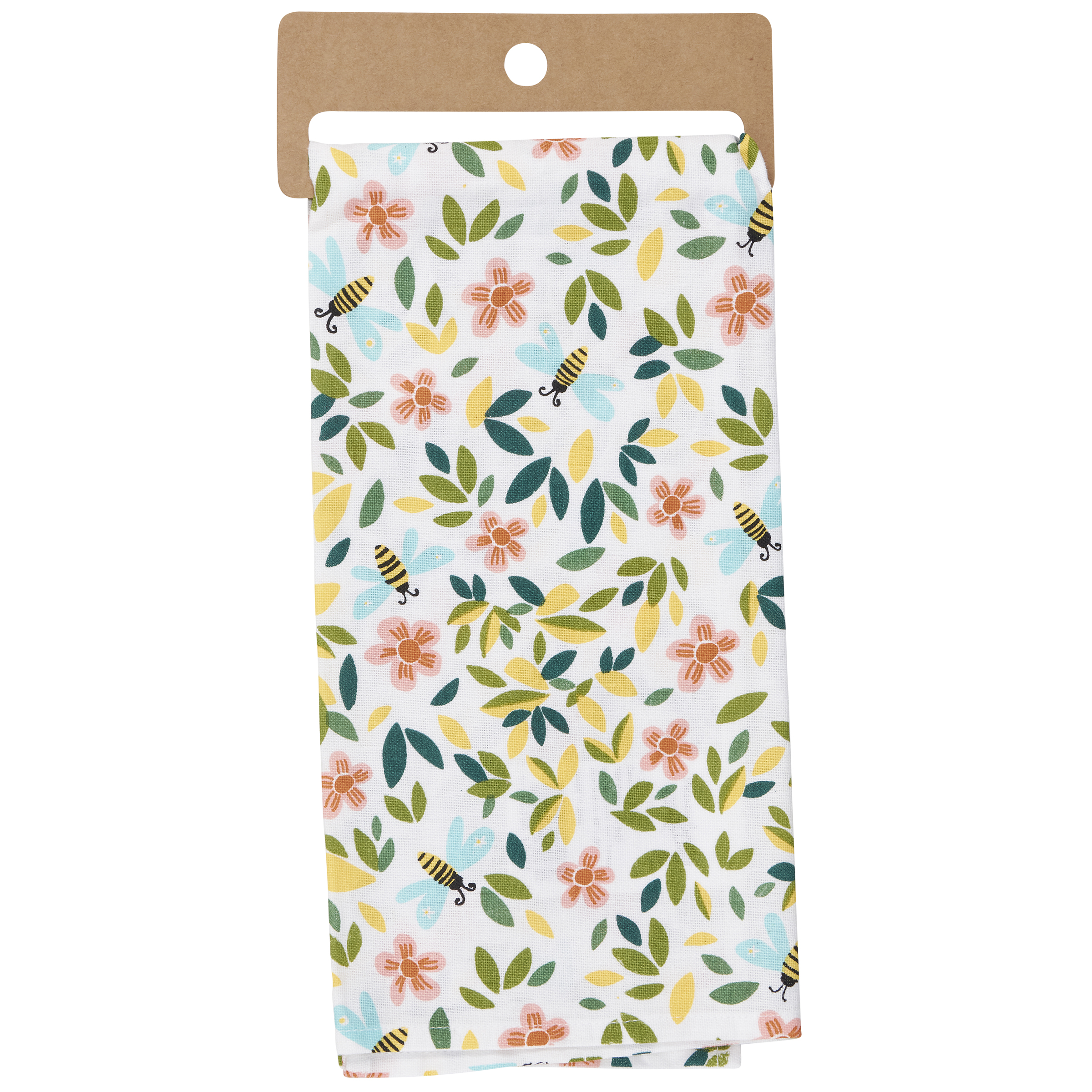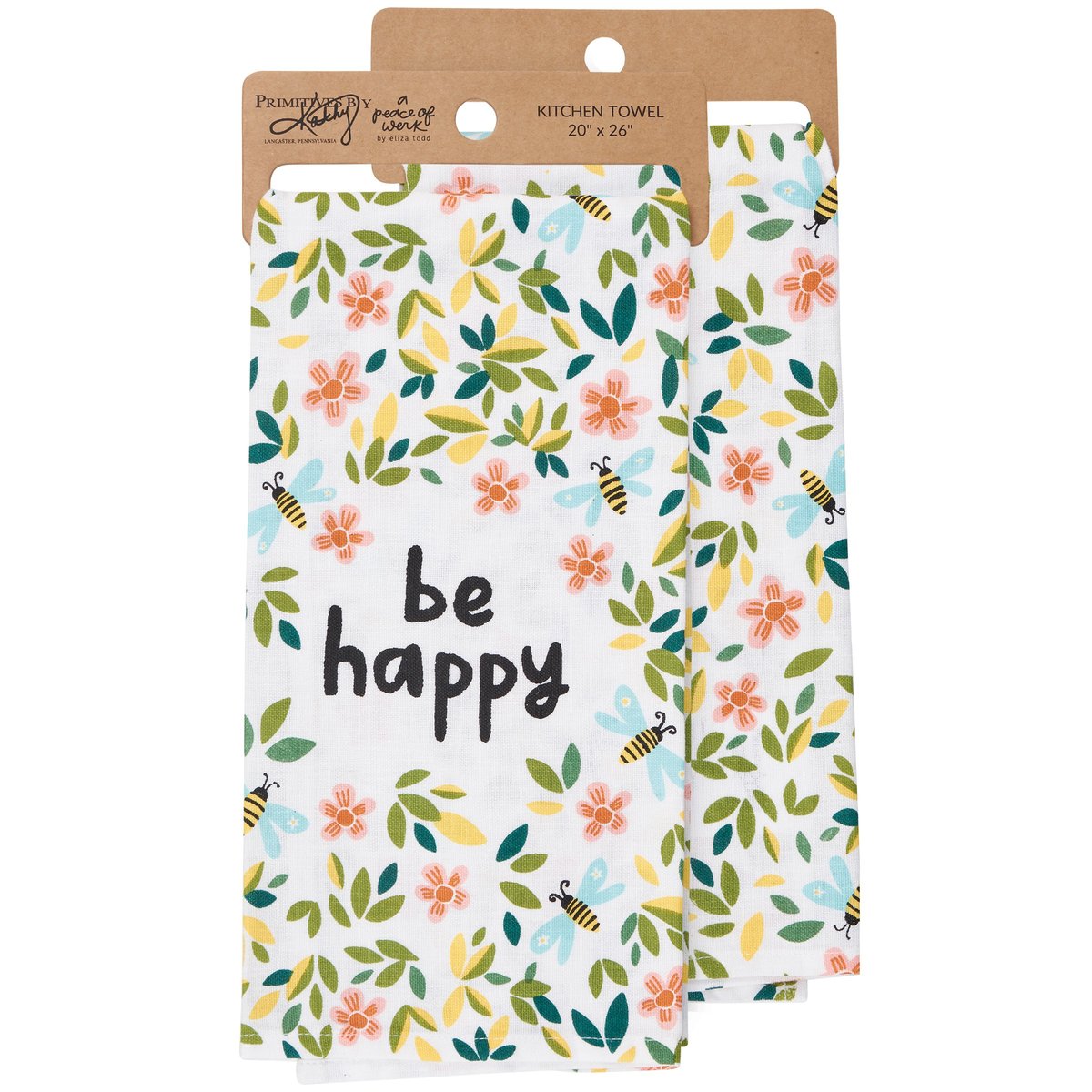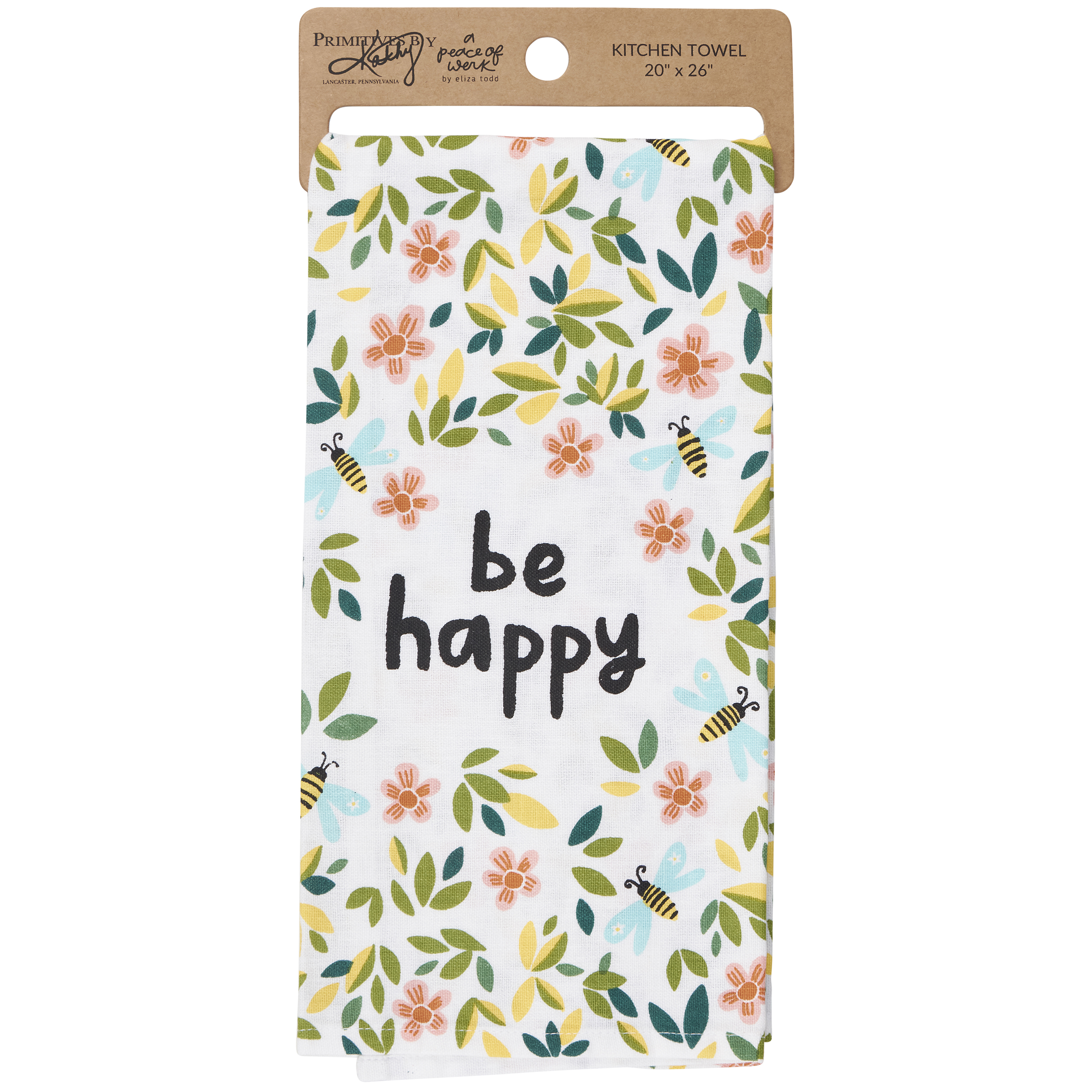 A cotton-linen blend kitchen towel from our Inspiration & Blooms Collection displaying an all-over design of colorful bees and flowers surrounding an inspirational sentiment that reads "Be Happy." Our Floral Be Happy kitchen towel is conveniently machine-washable for easy cleaning. Packaged on a cardboard hanger with hole to easily display on rack. An inspirational kitchen accessory perfect for everyday use.