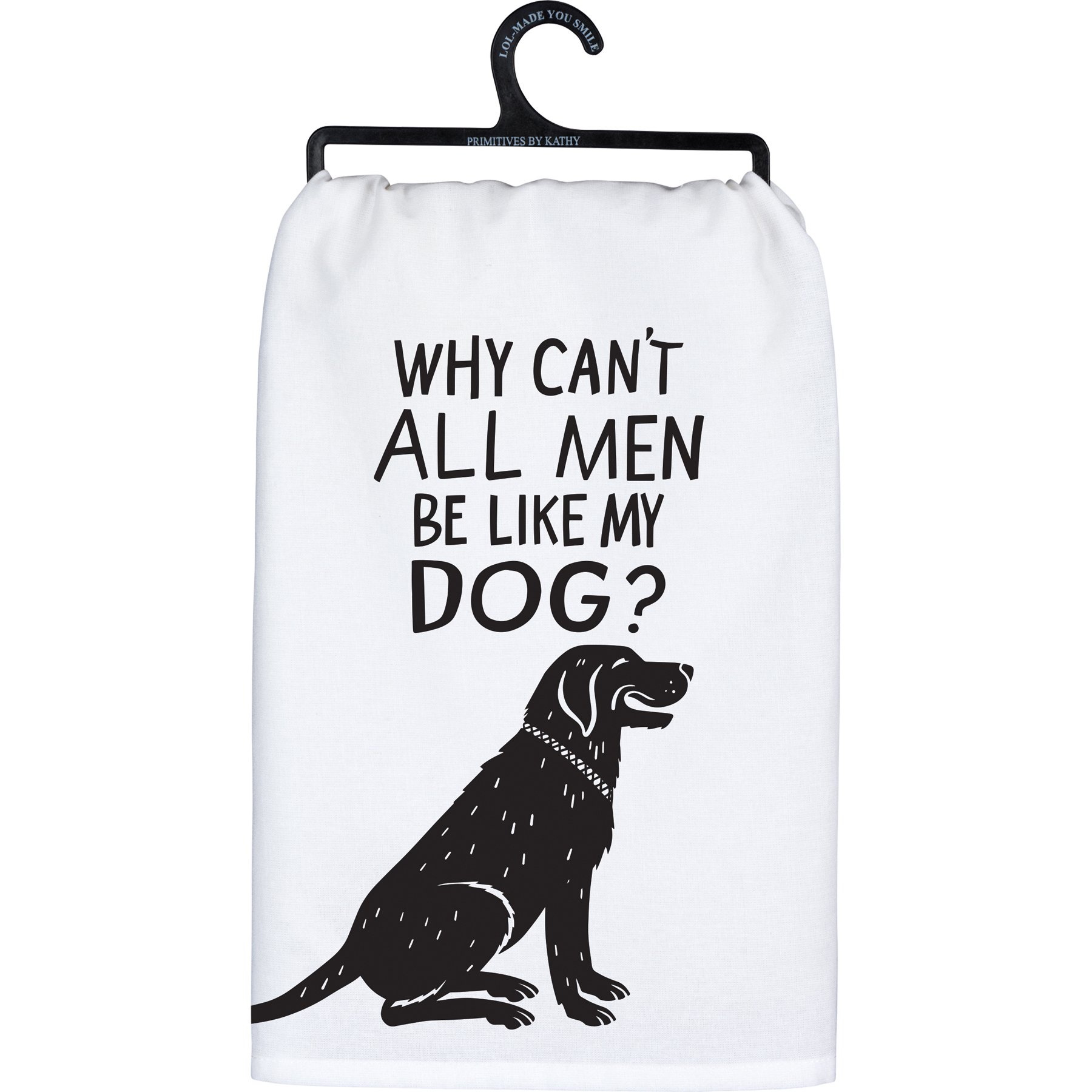 A black and white cotton kitchen towel from our Pet Collection displaying a fun hand illustrated design of a happy dog with a humorous "Why Can't All Men Be Like My Dog?" sentiment. Our Be Like My Dog kitchen towel is machine-washable for convenient cleaning. Packaged on a black plastic hanger to easily display on rack. A fun and functional everyday kitchen accent.