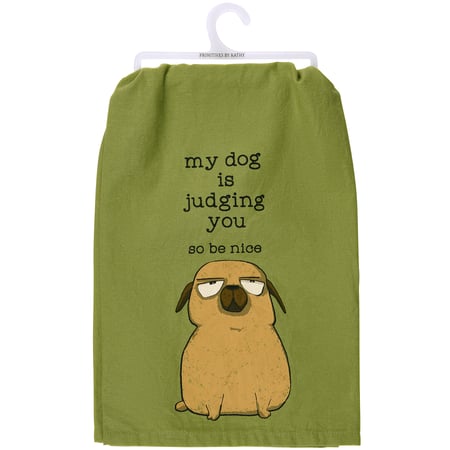 A rustic-inspired cotton kitchen towel from our Pet Collection displaying a design of a sassy dog with a pet-themed sentiment that reads "My Dog Is Judging You So Be Nice." Our Be Nice kitchen towel is conveniently machine-washable for easy cleaning. Packaged on a clear plastic hanger to easily display on rack. A fun pet-themed kitchen accessory perfect for everyday use.