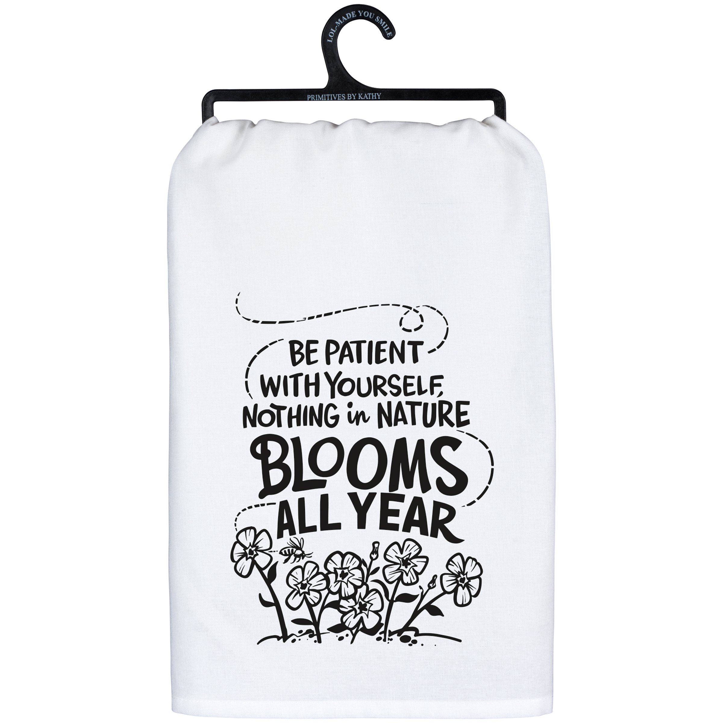 A black and white cotton kitchen towel from our LOL-Made You Smile Collection displaying a playful hand illustrated design of flowers and a bee under a fun inspirational sentiment that reads "Be Patient With Yourself - Nothing In Nature Blooms All Year." Our Be Patient kitchen towel is conveniently machine-washable for easy cleaning. This inspirational kitchen towel is packaged on a black plastic hanger to easily display on rack. A fun inspirational gift perfect for an everyday kitchen accessory.