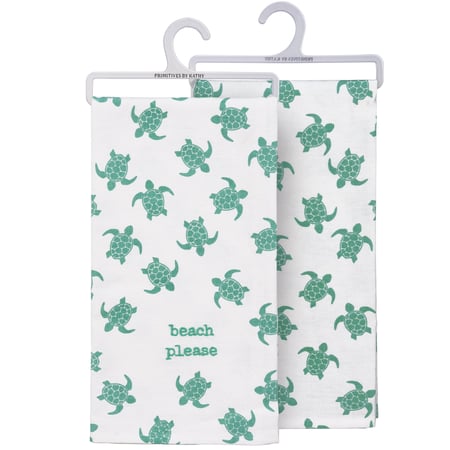 A cotton kitchen towel featuring an all-over sea turtle design with embroidered "Beach Please" sentiment. Our Beach Please kitchen towel is machine-washable.