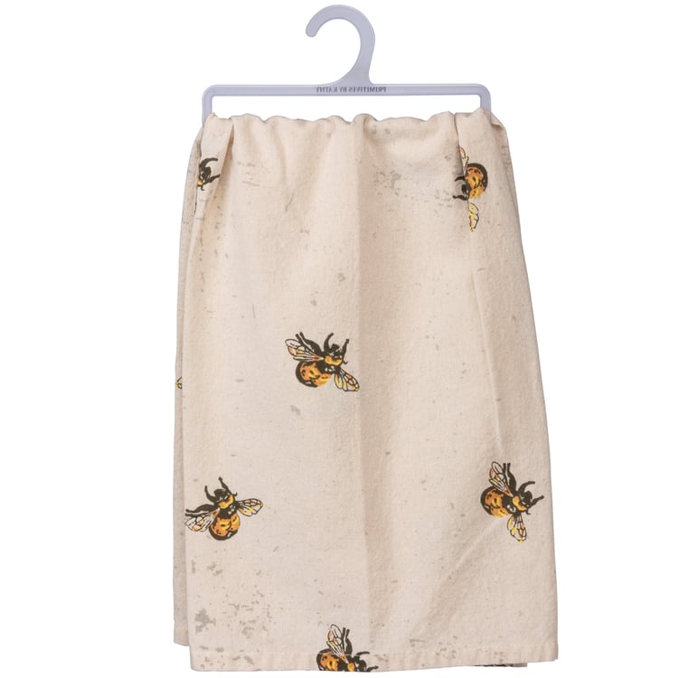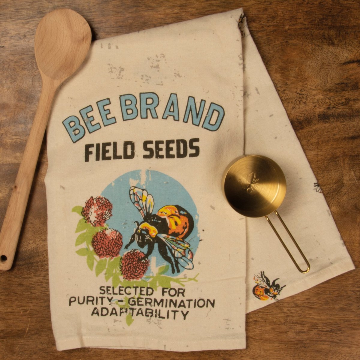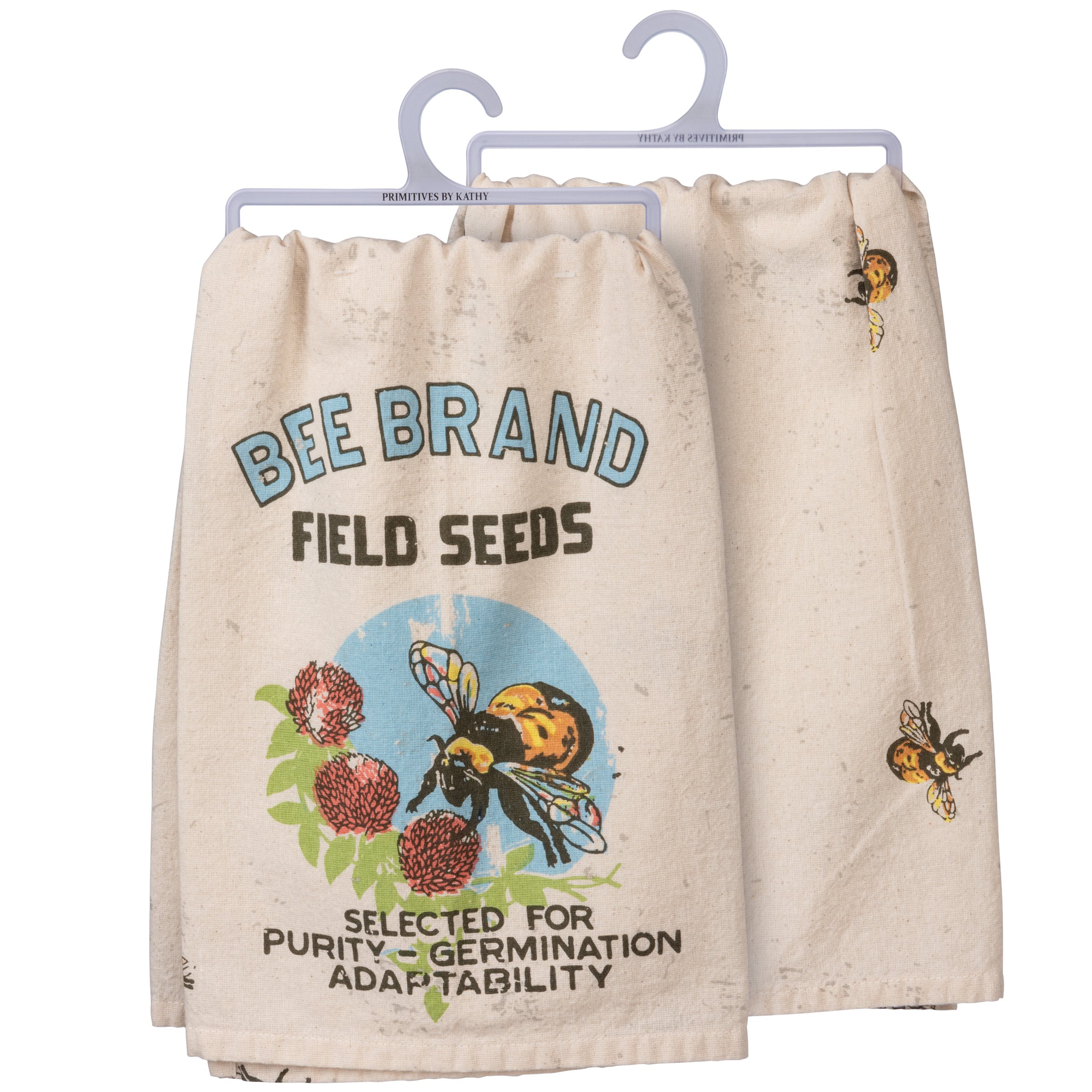 A feedsack-inspired cotton kitchen towel featuring a "Bee Brand Field Seeds Selected For Purity Germination Adaptability" sentiment with bee designs throughout. Machine-washable.