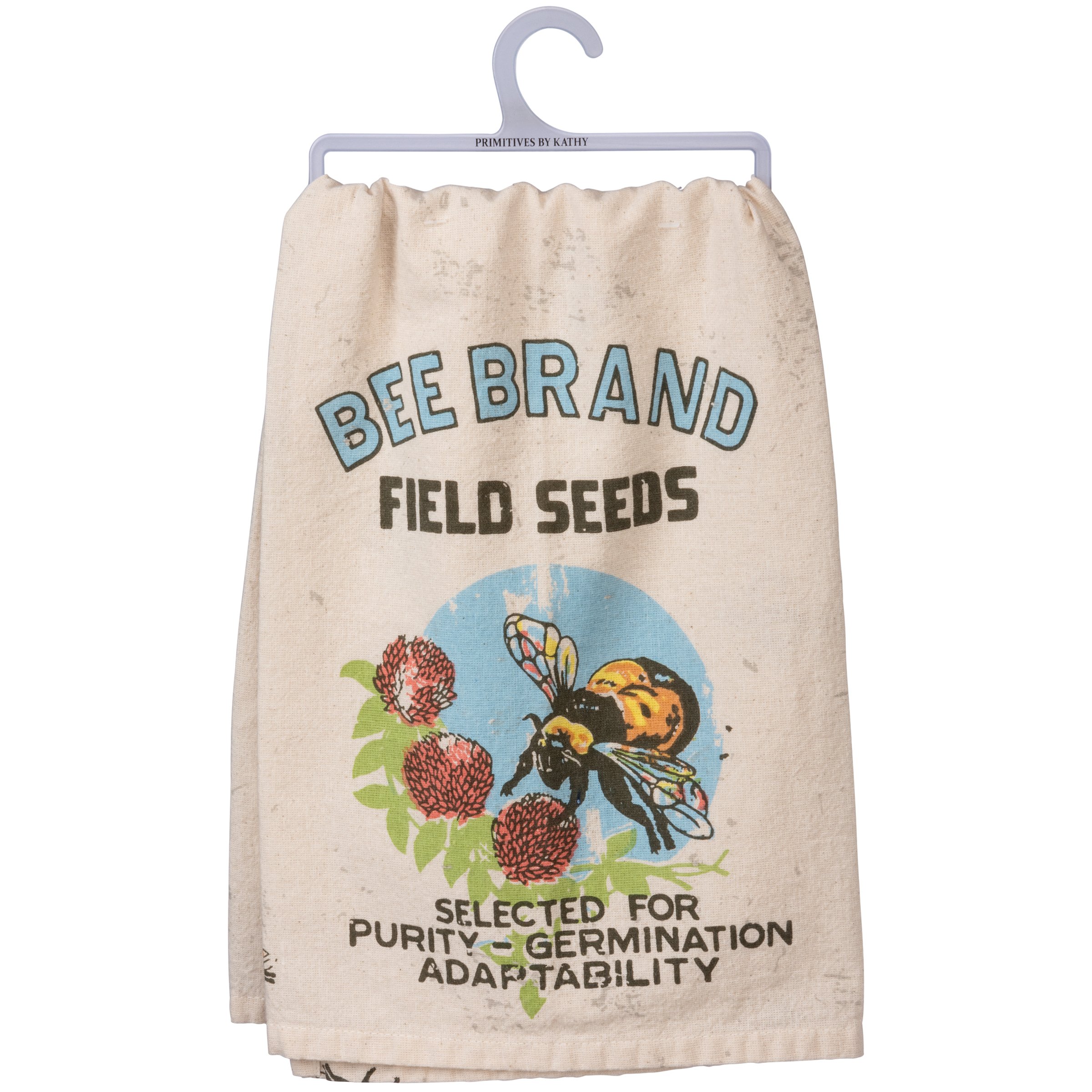 A feedsack-inspired cotton kitchen towel featuring a "Bee Brand Field Seeds Selected For Purity Germination Adaptability" sentiment with bee designs throughout. Machine-washable.