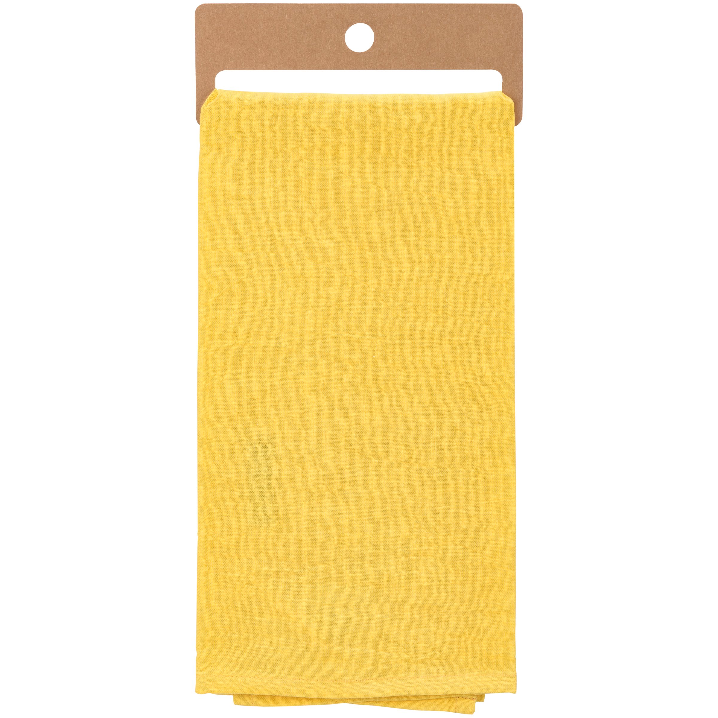 A cotton kitchen towel from our Garden Collection featuring a stitched art panel with "Bee Kind" sentiment and bee design. Our Bee Kind kitchen towel is machine-washable. Towel is packaged on a cardboard hanger with a hole to easily hang on rack.