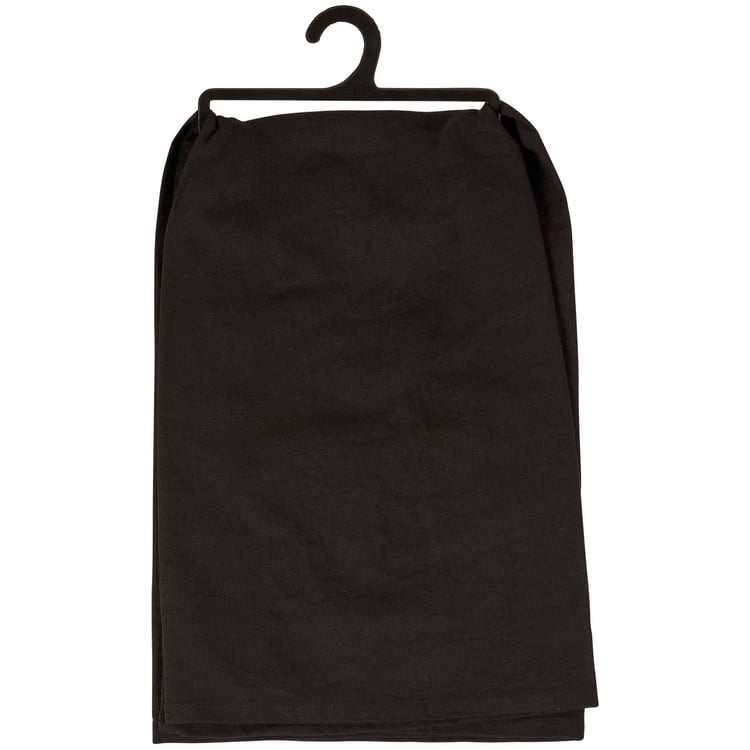 A black cotton kitchen towel from our Halloween Collection displaying a unique hand illustrated design of a skeleton drinking coffee with a fun Halloween inspired sentiment that reads "Nightmare Before Coffee." Design and sentiment are replicated from original hand illustrated artwork in a fun neon color palette that also looks great in blacklight. Our Before Coffee kitchen towel is conveniently machine-washable for easy cleaning. Seasonal kitchen towel is packaged on a black plastic hanger to easily display on rack. A fun Halloween-themed kitchen accessory perfect for seasonal use.