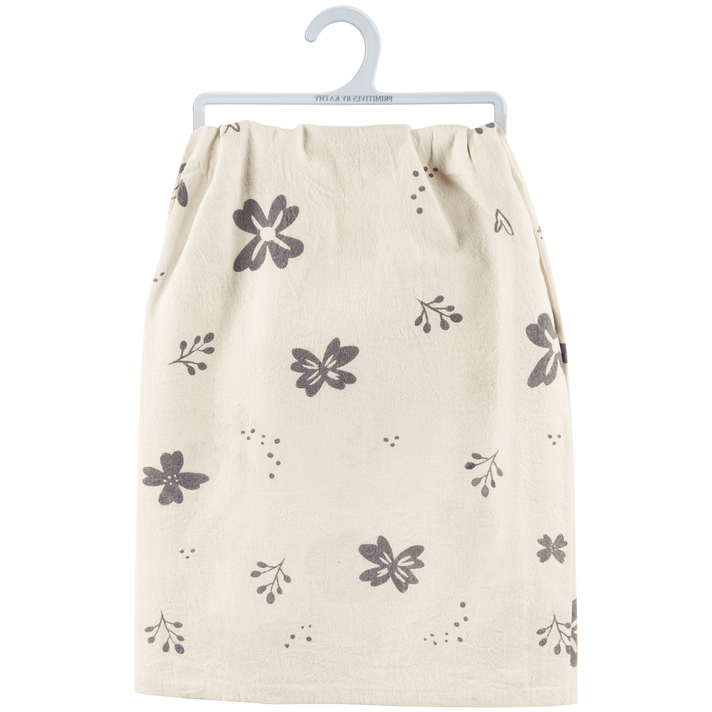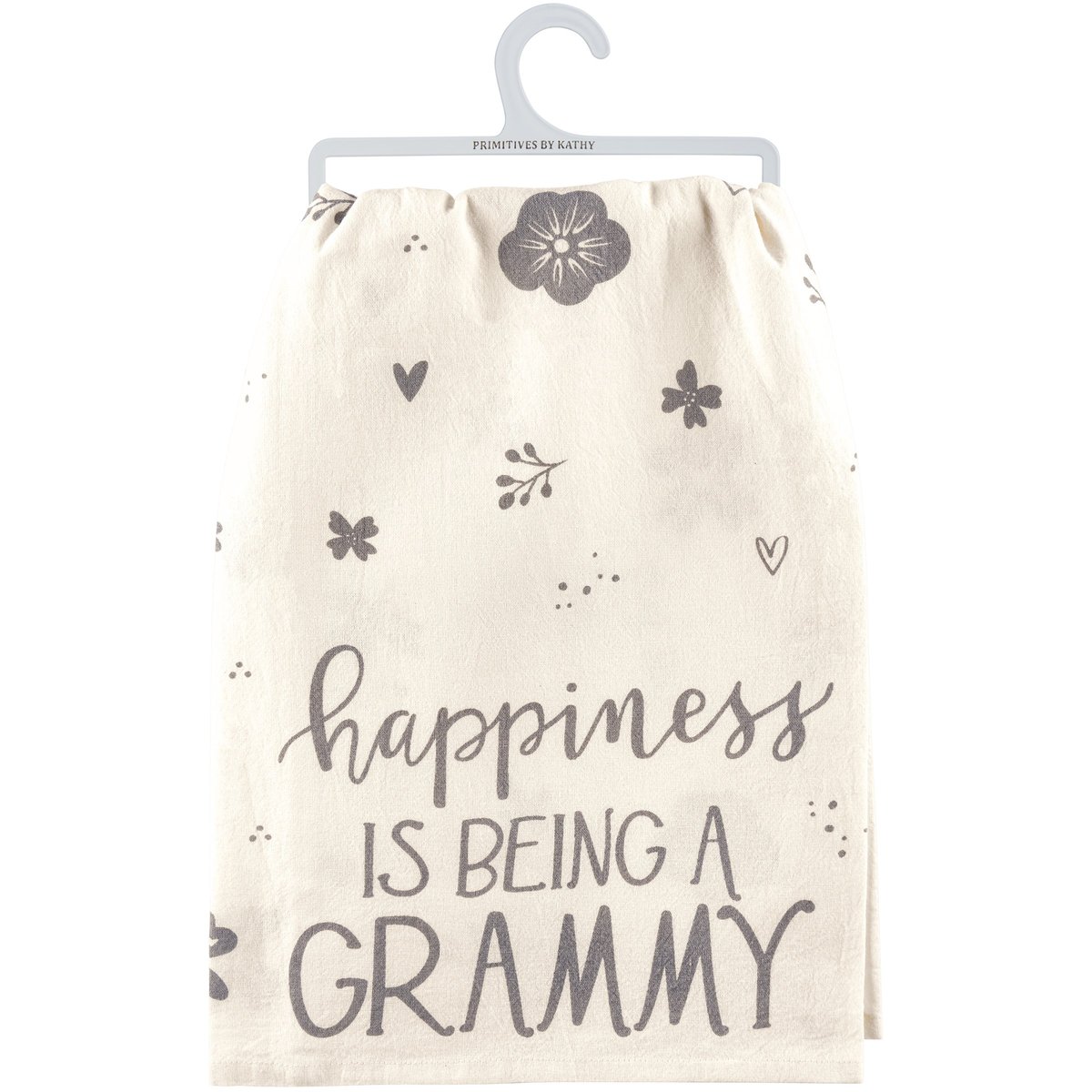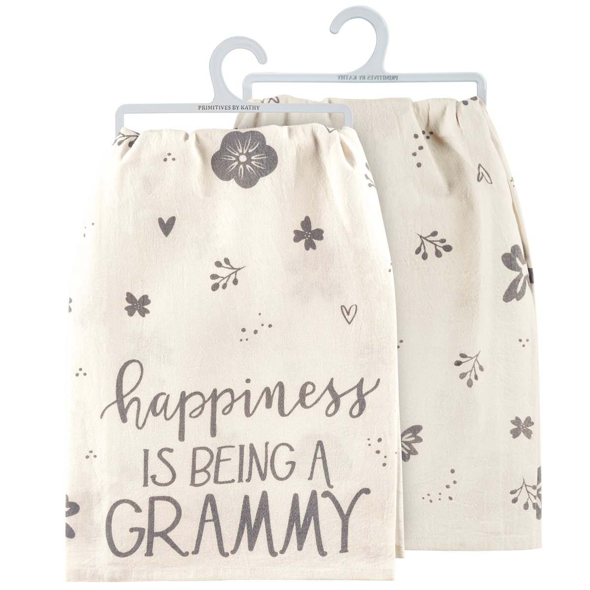 A cream cotton kitchen towel from our Hand Illustrated Collection displaying an all-over design of florals with hand illustrated sentiment that reads "Happiness Is Being A Grammy." Our Being A Grammy kitchen towel is machine-washable for convenient cleaning. Packaged on a clear plastic hanger to easily display on rack. A lovely and functional everyday kitchen accent.