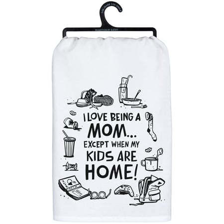 A black and white cotton kitchen towel from our Mother's Day Collection displaying a fun hand illustrated design featuring messy house items around a humorous mom-themed sentiment that reads "I Love Being A Mom... Except When My Kids Are Home!" Our Being A Mom kitchen towel is conveniently machine-washable for easy cleaning. Funny kitchen towel is packaged on a black plastic hanger to easily display on rack. A fun family gift perfect for an everyday kitchen accessory.