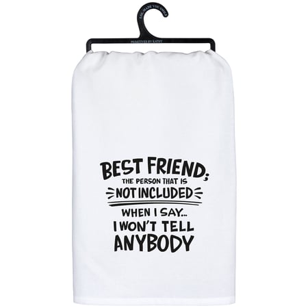 A black and white cotton kitchen towel from our LOL-Made You Smile Collection displaying a fun friendship themed sentiment in a unique hand illustrated style that reads "Best Friend; The Person That Is Not Included When I Say I Won't Tell Anybody." Our Best Friend kitchen towel is conveniently machine-washable for easy cleaning. This funny kitchen towel is packaged on a black plastic hanger to easily display on rack. A fun gift for friends perfect to use as an everyday kitchen accessory.