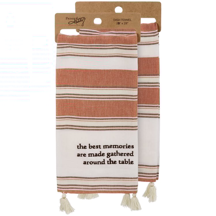 A cotton kitchen towel from our Fall & Harvest Collection features a fall-inspired color palette with embroidered "The Best Memories Are Made Gathered Around The Table" sentiment and woven stripe designs. Includes tassel accents for added interest. Towel is packaged on a cardboard hanger to easily display on rack. Our The Best Memories Are Made Gathered Around The Table kitchen towel is machine-washable.