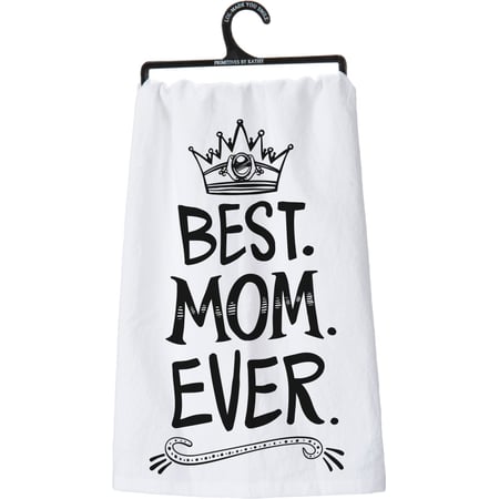 A cotton kitchen towel lending "Best. Mom. Ever." hand lettered sentiment with crown design that complements well with existing kitchen decor. Machine-washable.