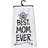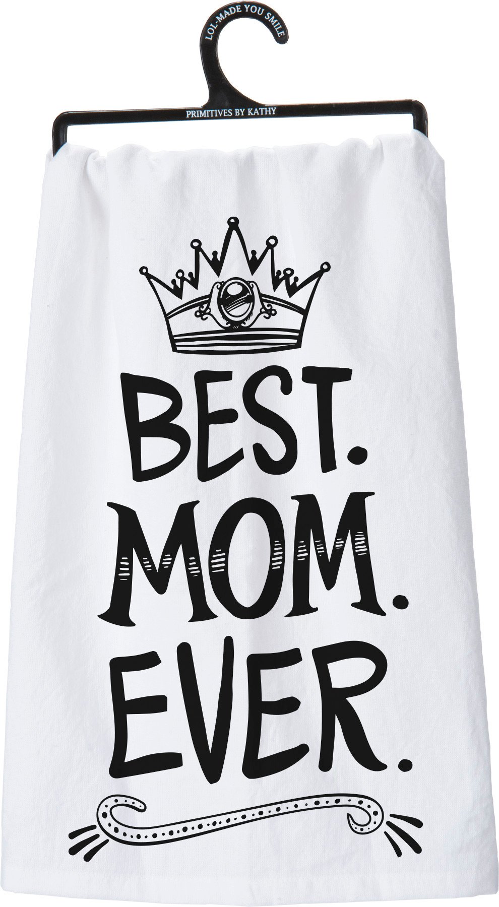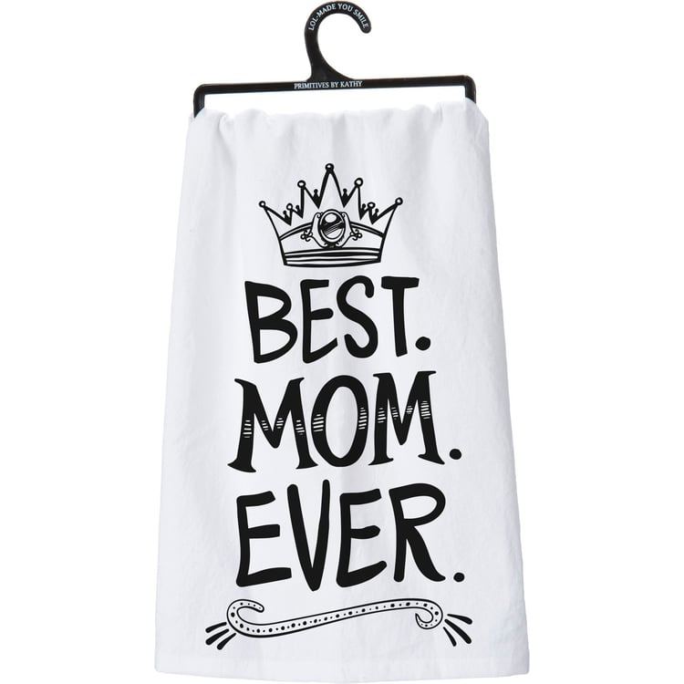 A cotton kitchen towel lending "Best. Mom. Ever." hand lettered sentiment with crown design that complements well with existing kitchen decor. Machine-washable.