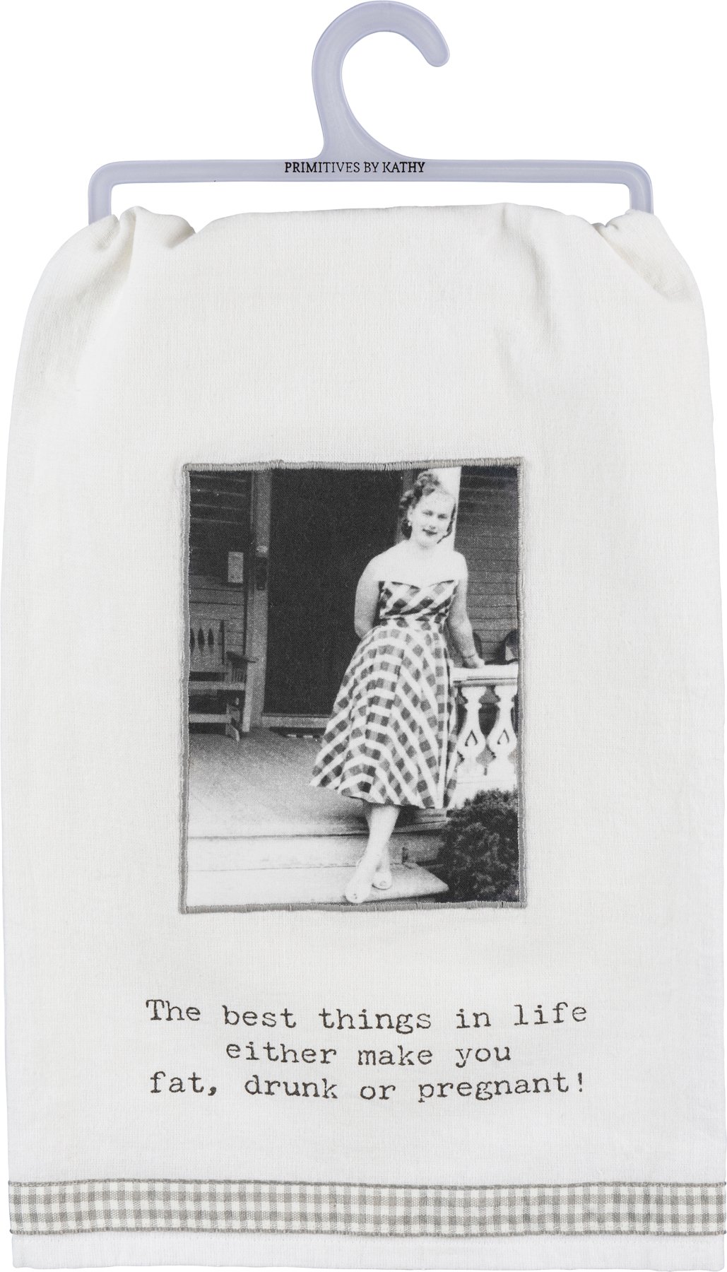 A cotton kitchen towel lending a "The Best Things In Life Either Make You Fat, Drunk Or Pregnant!" sentiment, featuring vintage photography panel stitched accents, and gingham trim. Complements well with coordinating design pieces for a humorous kitchen decor collection. Machine-washable.