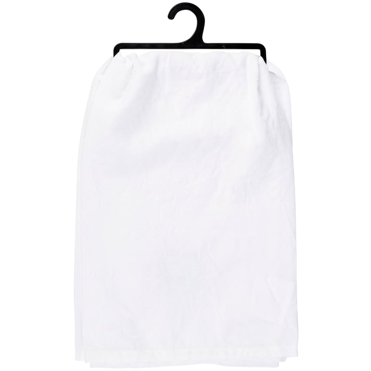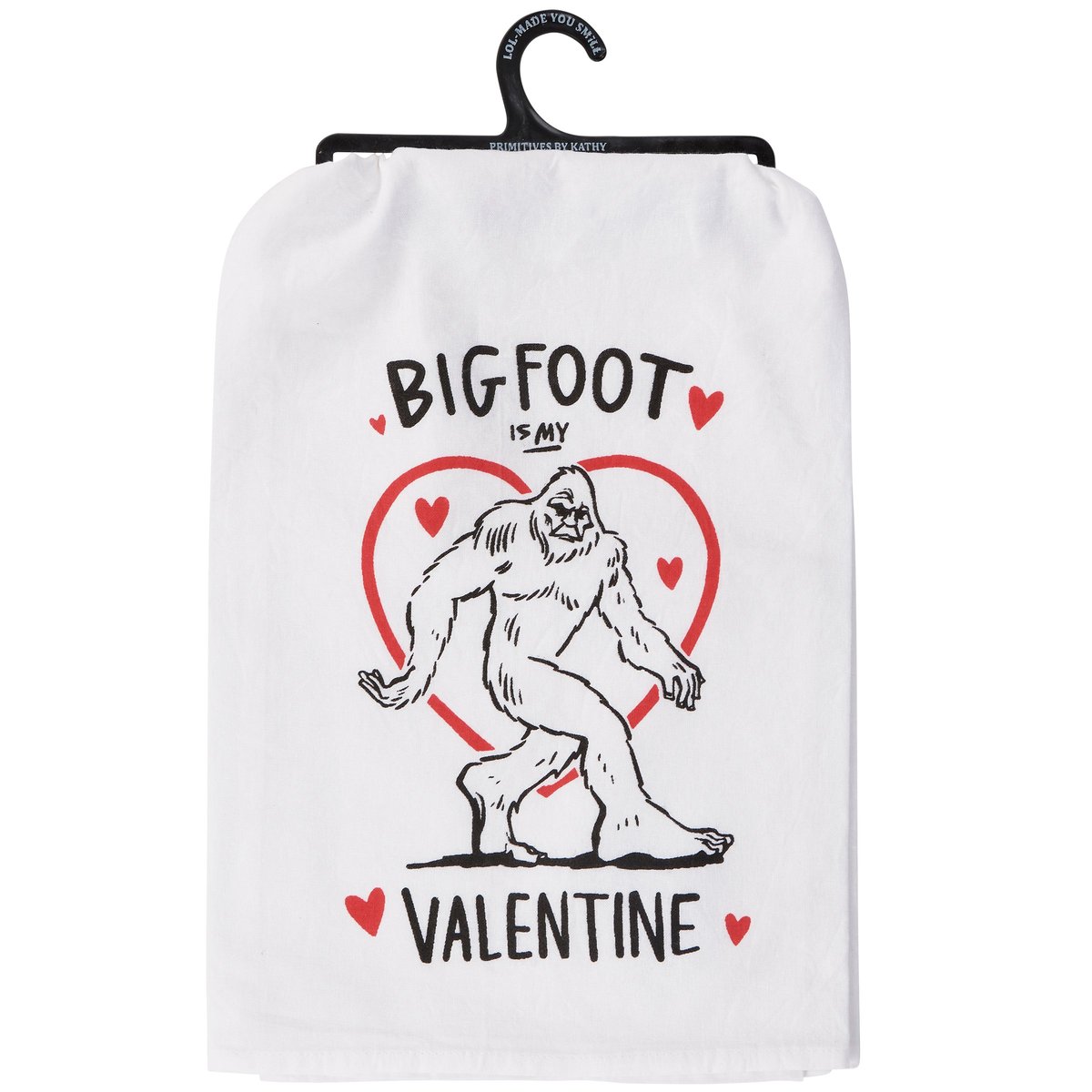 A black and white cotton kitchen towel from our Valentine's Day Collection displaying a unique hand illustrated design of bigfoot with red heart accents and a fun love-themed sentiment that reads "Bigfoot Is My Valentine." Our Bigfoot Valentine kitchen towel is conveniently machine-washable for easy cleaning. Packaged on a black plastic hanger to easily display on rack. A fun Valentine's Day gift perfect for a seasonal kitchen accessory.