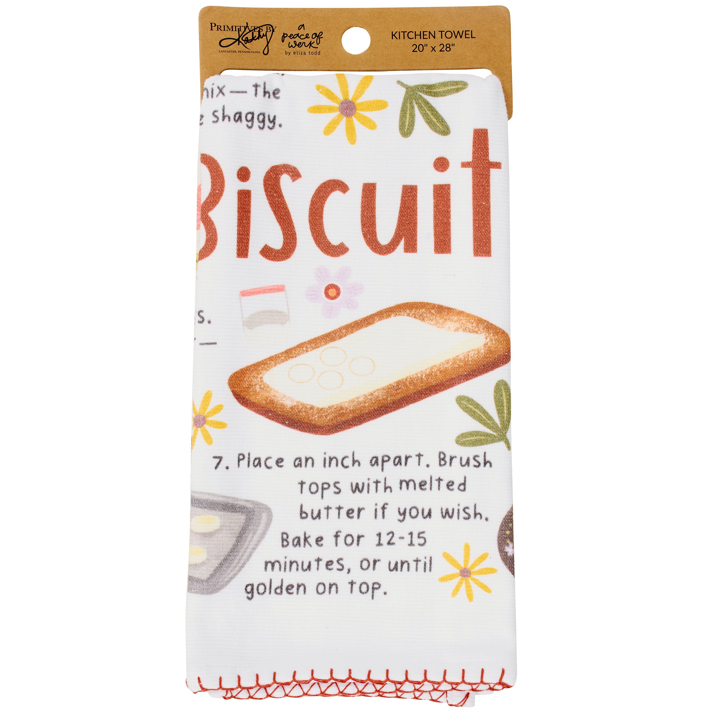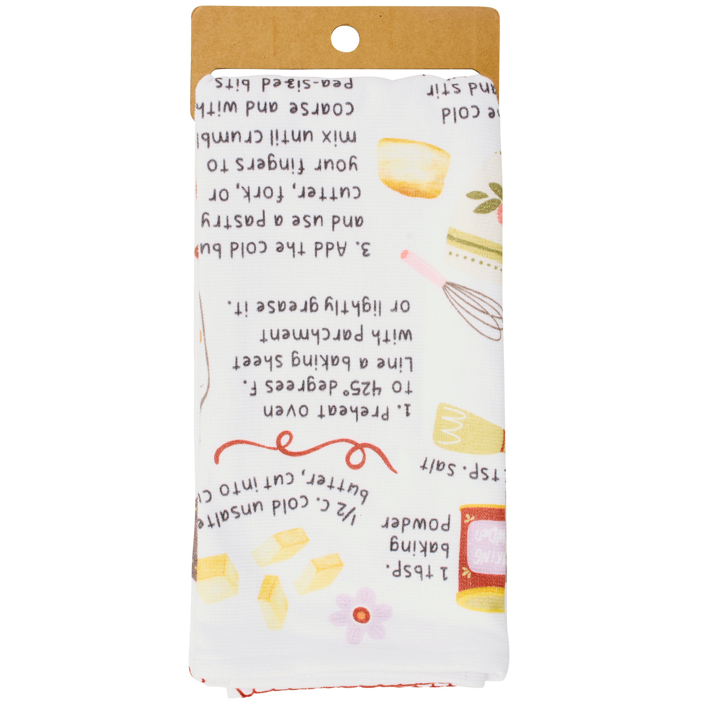 A cotton kitchen towel from our Homestead Collection displaying a fun recipe inspired all-over design replicated from original hand illustrated art. Homestead recipe design features instructions for making homemade biscuits with coordinating illustrations. Biscuits recipe is printed on textured slub fabric with a complementing brown hem stitch at the bottom. Recipe kitchen towel features a terrycloth layer on the back for added absorbency and corner loop for hanging. Our Biscuits Recipe kitchen towel is conveniently machine-washable for easy cleaning. Kitchen towel is packaged on a cardboard hanger with hole to easily display on rack. A fun recipe themed gift perfect for an everyday kitchen accessory.