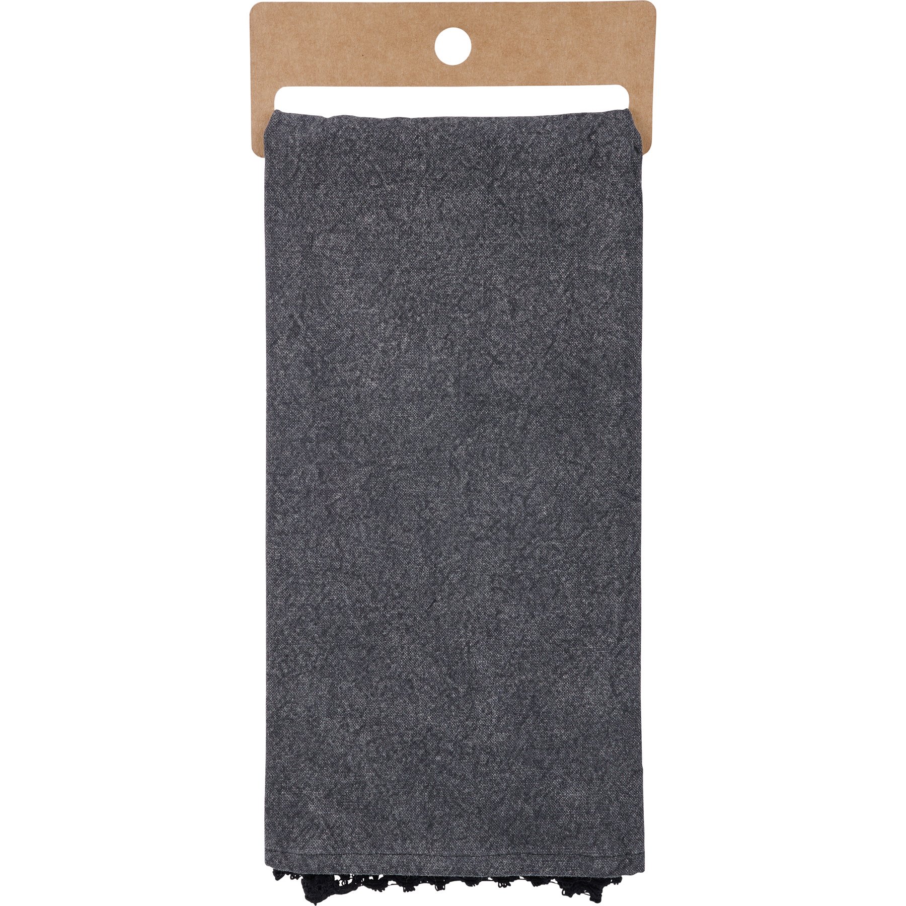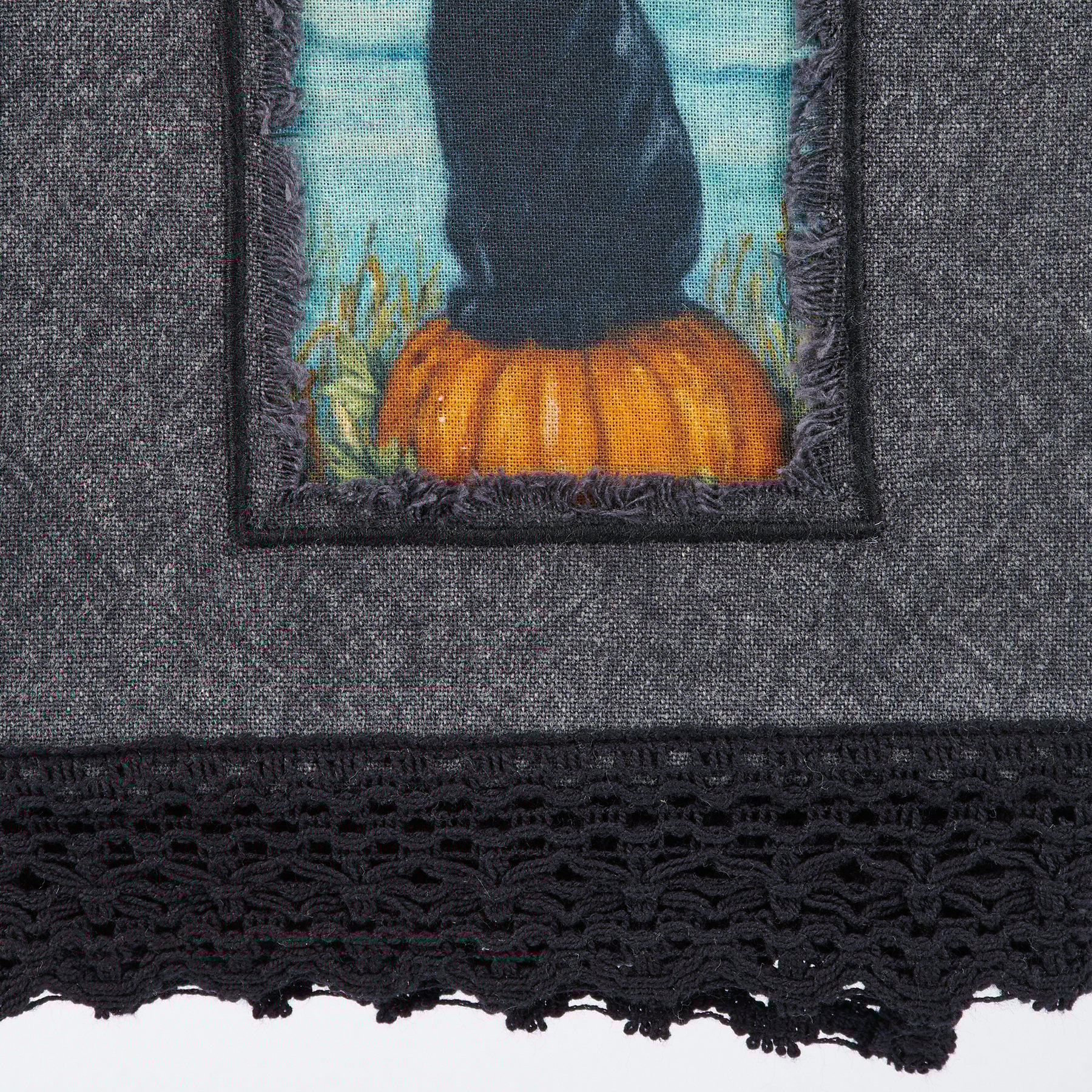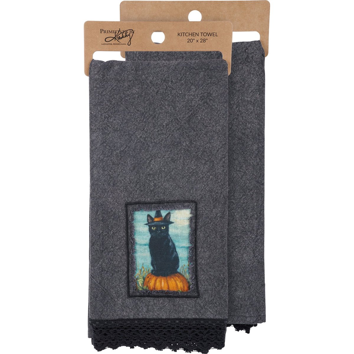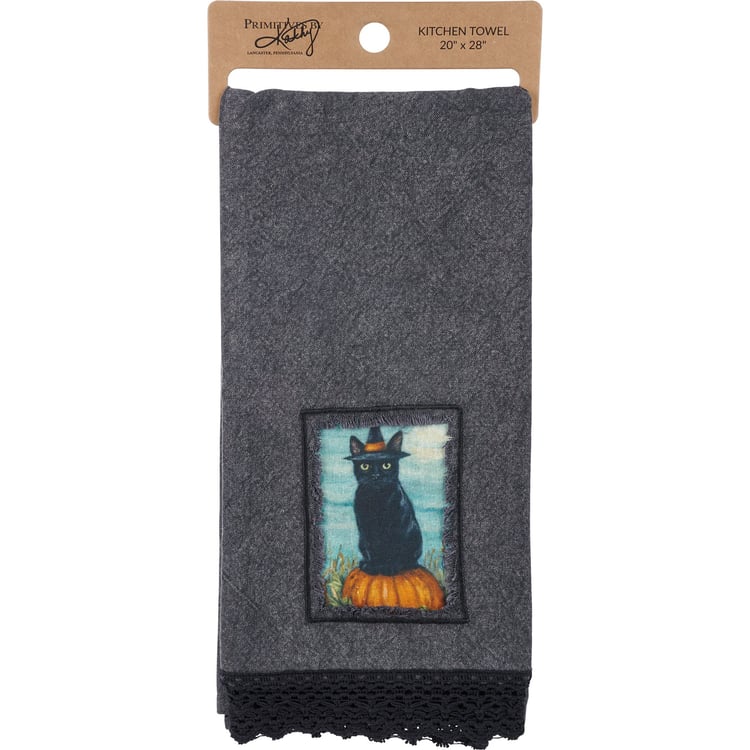 A cotton kitchen towel from our Halloween Collection featuring a stitched art panel with frayed edge on stonewashed black background and black lace trim. Design displays a black cat wearing a witch hat sitting on a pumpkin replicated from original artwork painted onto burlap canvas, giving the art a unique depth and texture. Our Black Cat kitchen towel is machine-washable for convenient cleaning. Packaged on a cardboard hanger with hole to easily display on rack. A charming and functional seasonal kitchen accent.