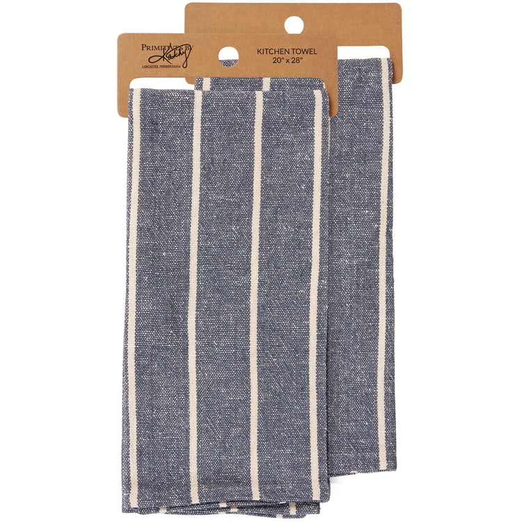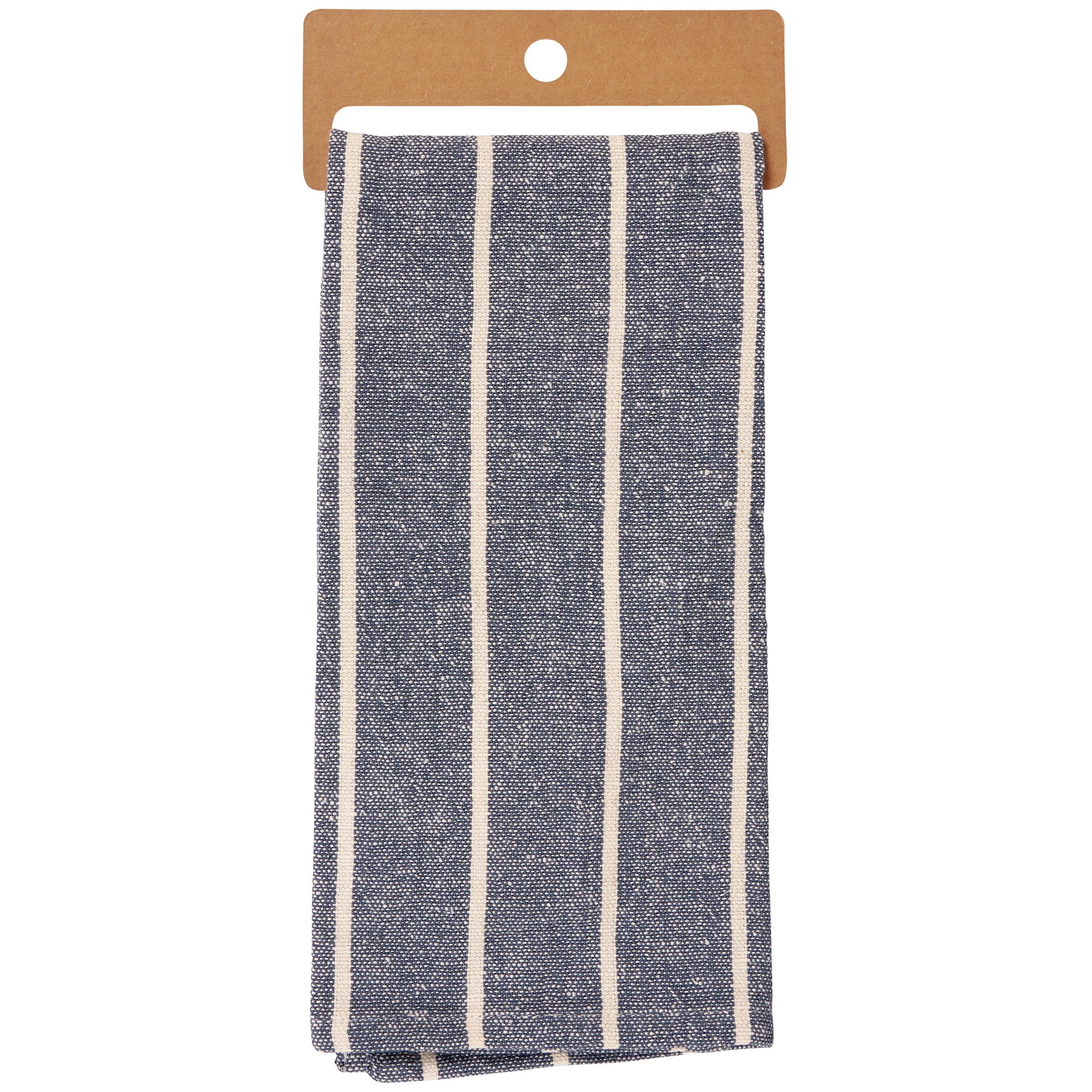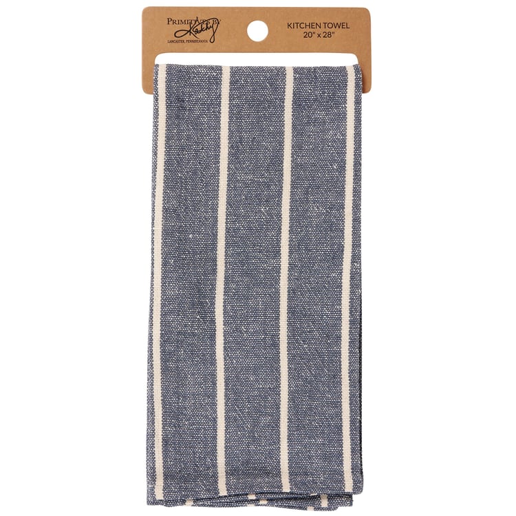 A cotton kitchen towel from our Beach Collection displaying a nautical inspired design with blue and cream colored stripes woven throughout. Our Blue Cream Stripe kitchen towel is conveniently machine-washable for easy cleaning. Nautical kitchen towel is packaged on a cardboard hanger with hole to easily display on rack. A rustic beach-themed kitchen accessory perfect for everyday use.