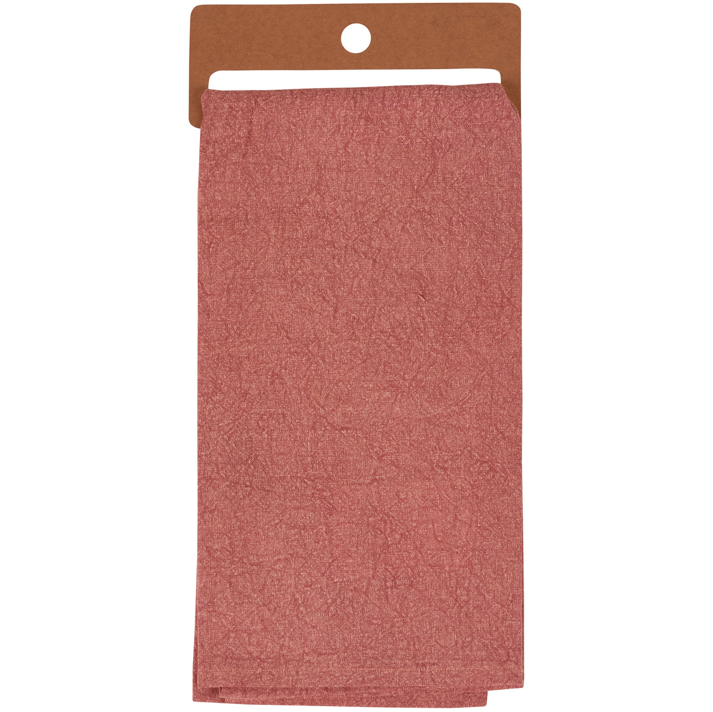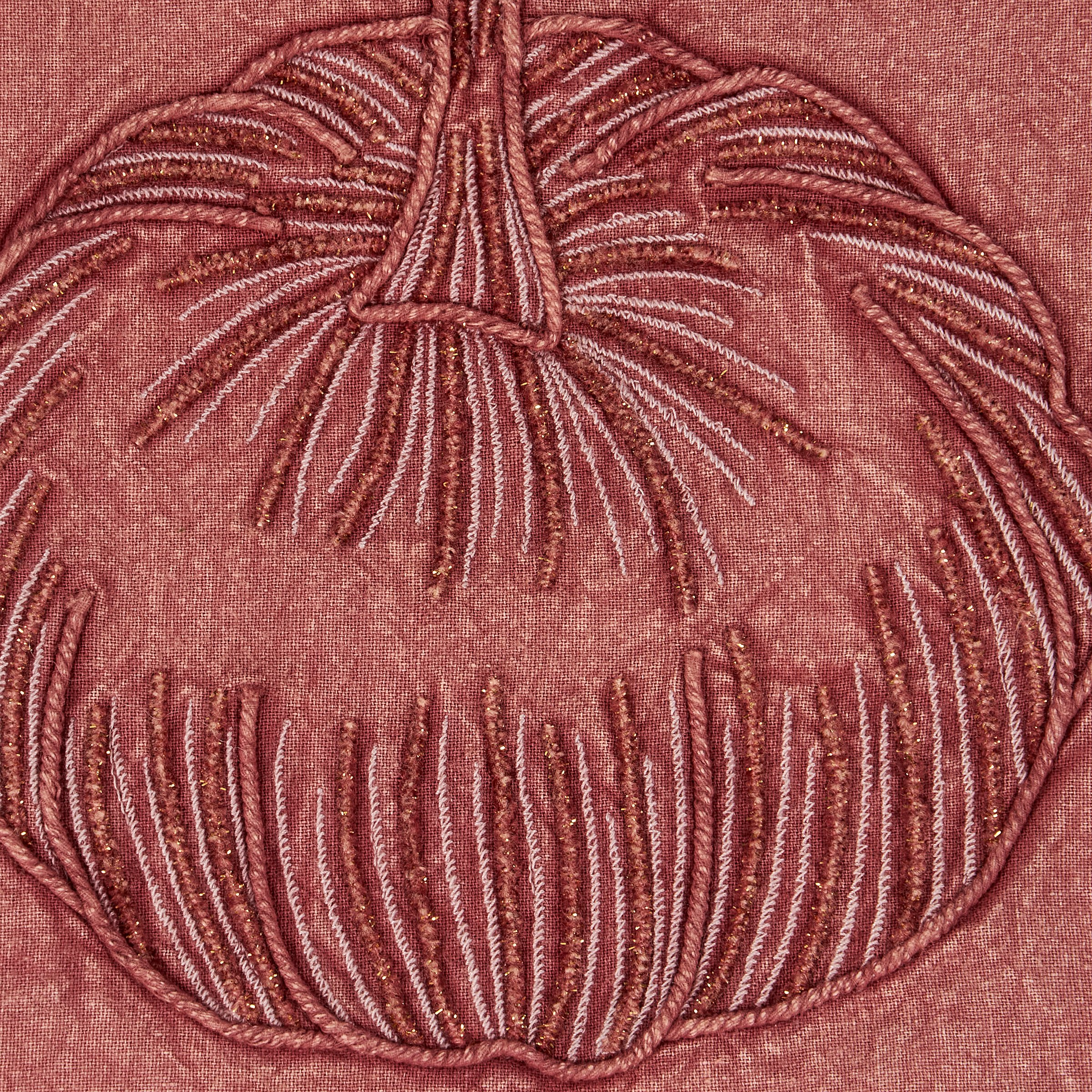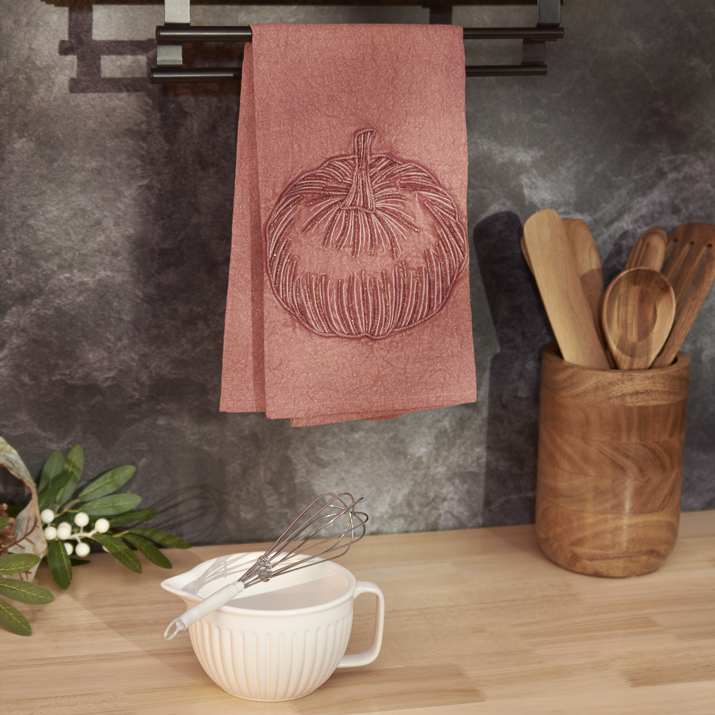 A cotton-linen blend kitchen towel from our Fall & Harvest Collection displaying blush inspired autumn red color and a pumpkin design made with stitched and yarn details for added dimension. Kitchen towel is stonewashed for a naturally aged appearance. Our Blush Pumpkin kitchen towel is conveniently machine-washable for easy cleaning. Packaged on a cardboard hanger with hole to easily display on rack. A stylish fall-themed kitchen accessory perfect for seasonal use.