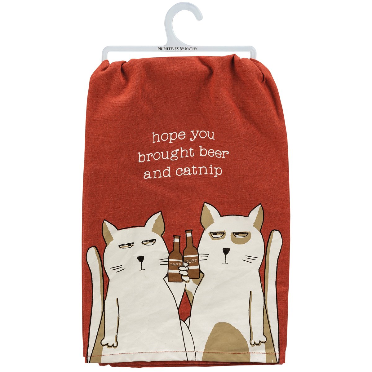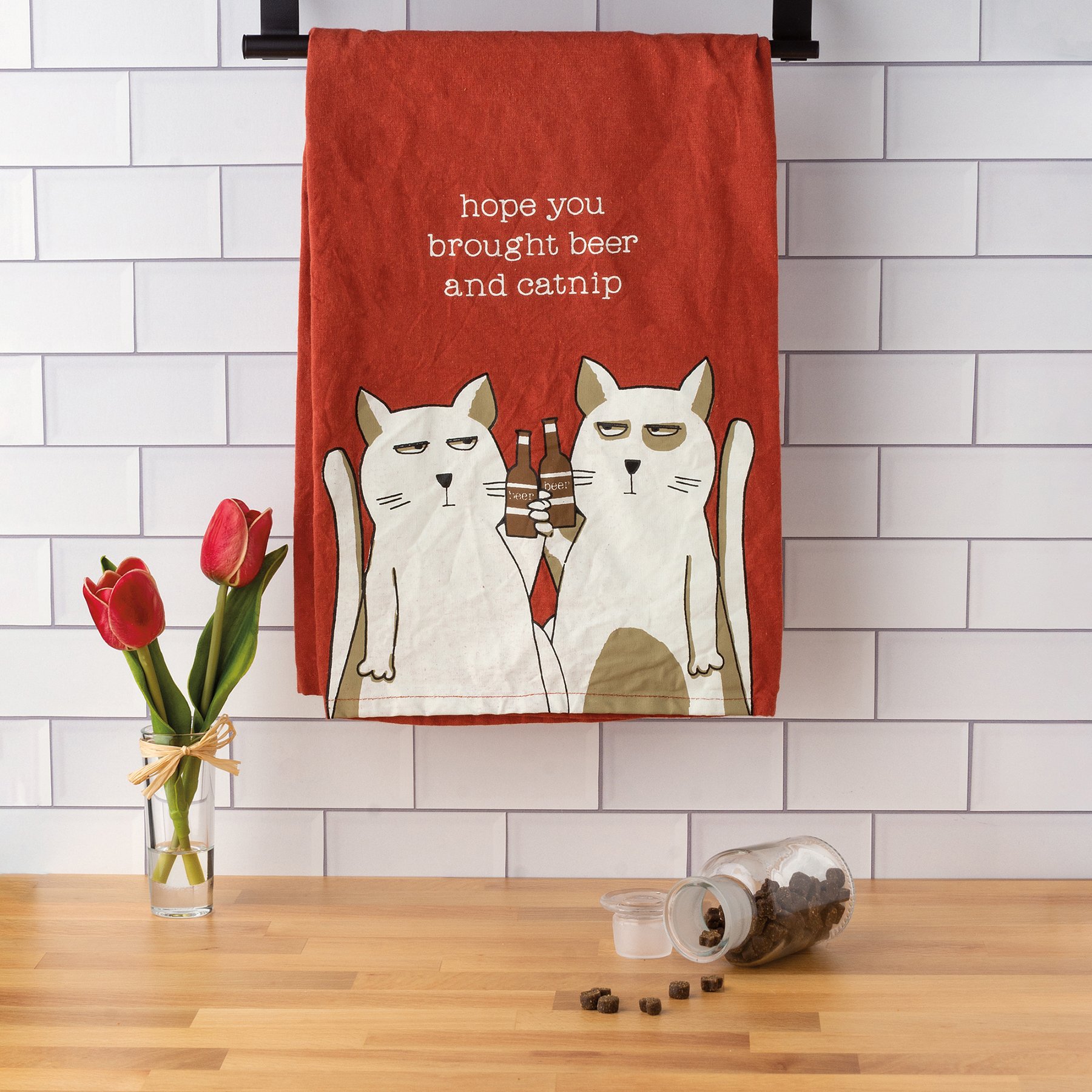A rustic-inspired cotton kitchen towel from our Pet Collection featuring a "Hope You Brought Beer And Catnip" sentiment with sassy cat and beer design. Our Hope You Brought Beer kitchen towel is machine-washable.