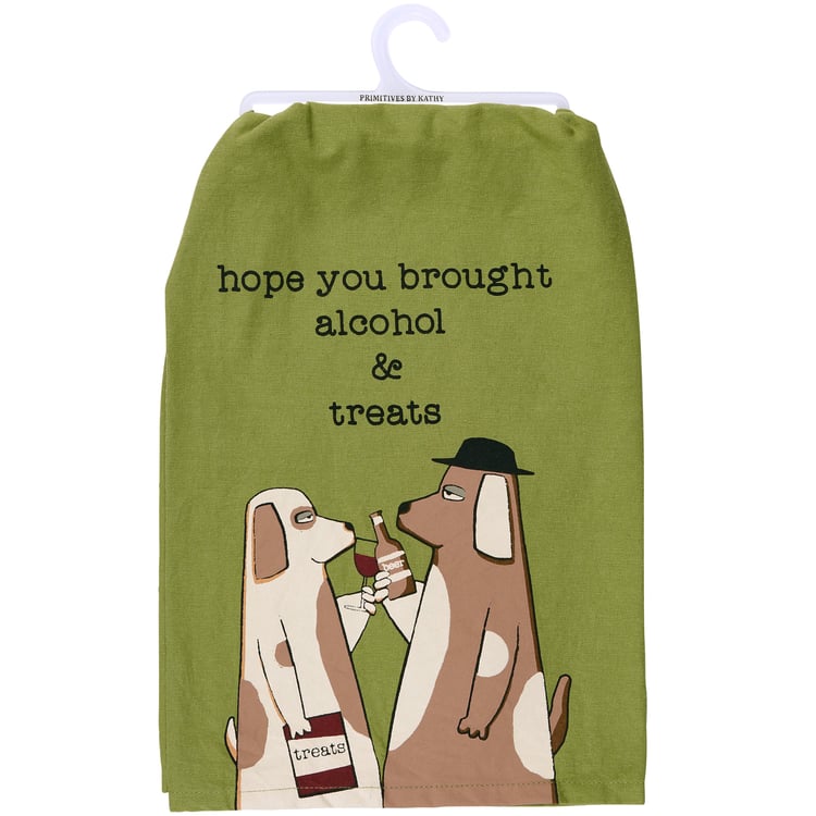 A rustic-inspired cotton kitchen towel from our Pet Collection displaying a design of sassy dogs holding drinks and a treat bag with a humorous sentiment that reads "Hope You Brought Alcohol & Treats." Our Brought Treats kitchen towel is conveniently machine-washable for easy cleaning. Packaged on a clear plastic hanger to easily display on rack. A fun pet-themed kitchen accessory perfect for everyday use.