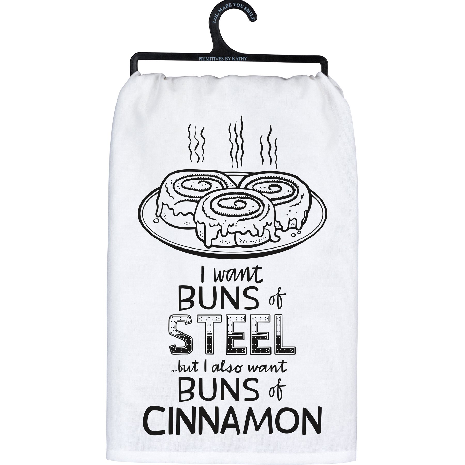 A black and white cotton kitchen towel from our LOL Made You Smile Collection displaying a hand illustrated design of a plate of cinnamon buns with humorous sentiment that reads "I Want Buns Of Steel... But I Also Want Buns Of Cinnamon." Our Buns Of Cinnamon kitchen towel is machine-washable for convenient cleaning. Packaged on a black plastic hanger to easily display on rack. A fun and functional everyday kitchen accent.