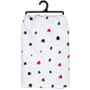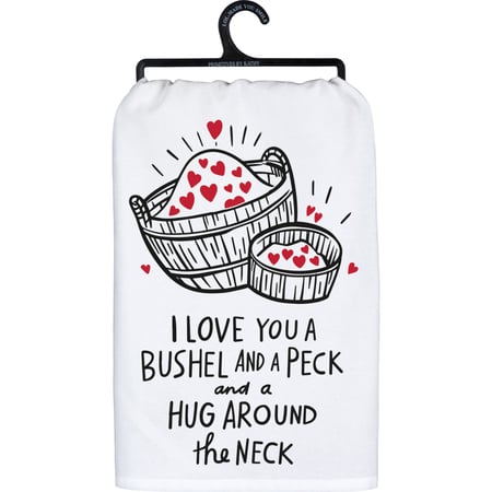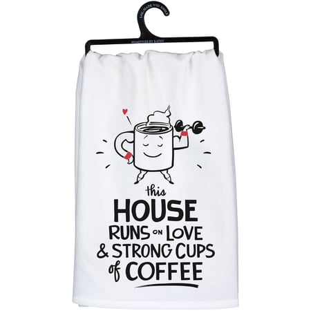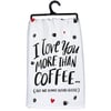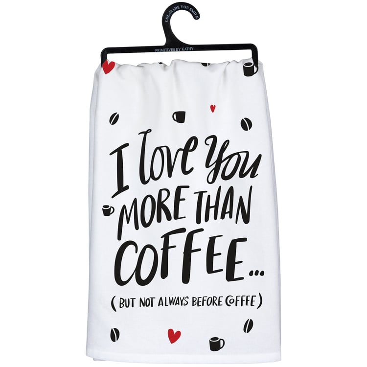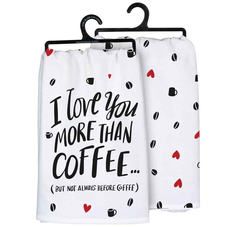 A cotton kitchen towel lending an "I Love You More Than Coffee (But Not Always Before Coffee) sentiment with heart, bean, and mug designs throughout. Machine-washable.