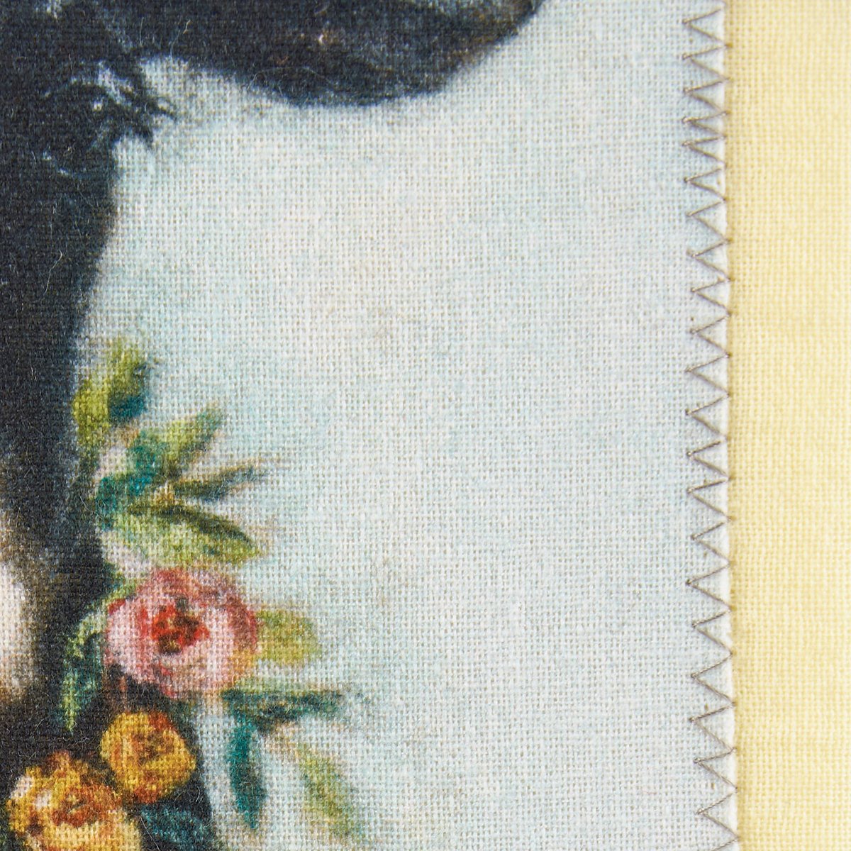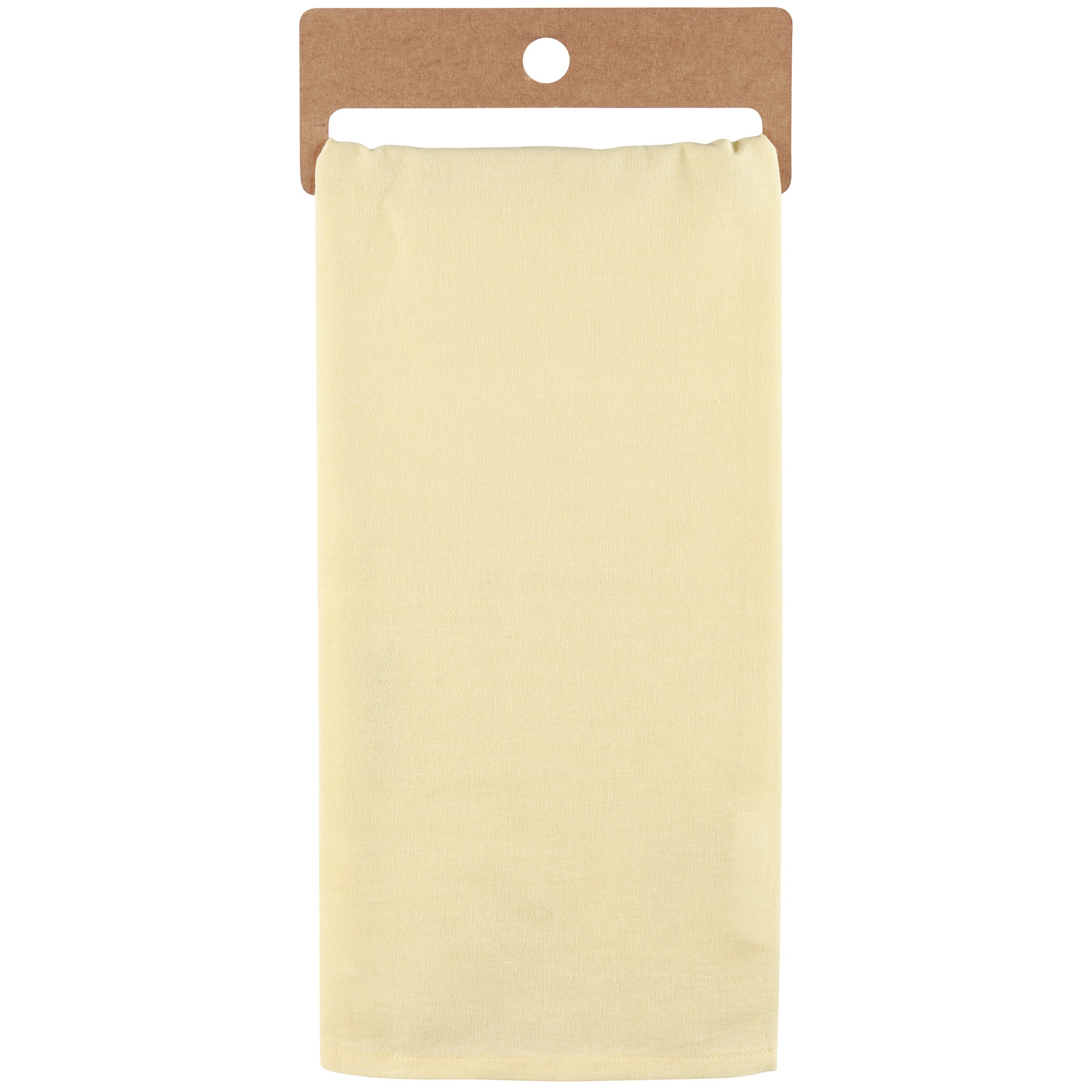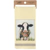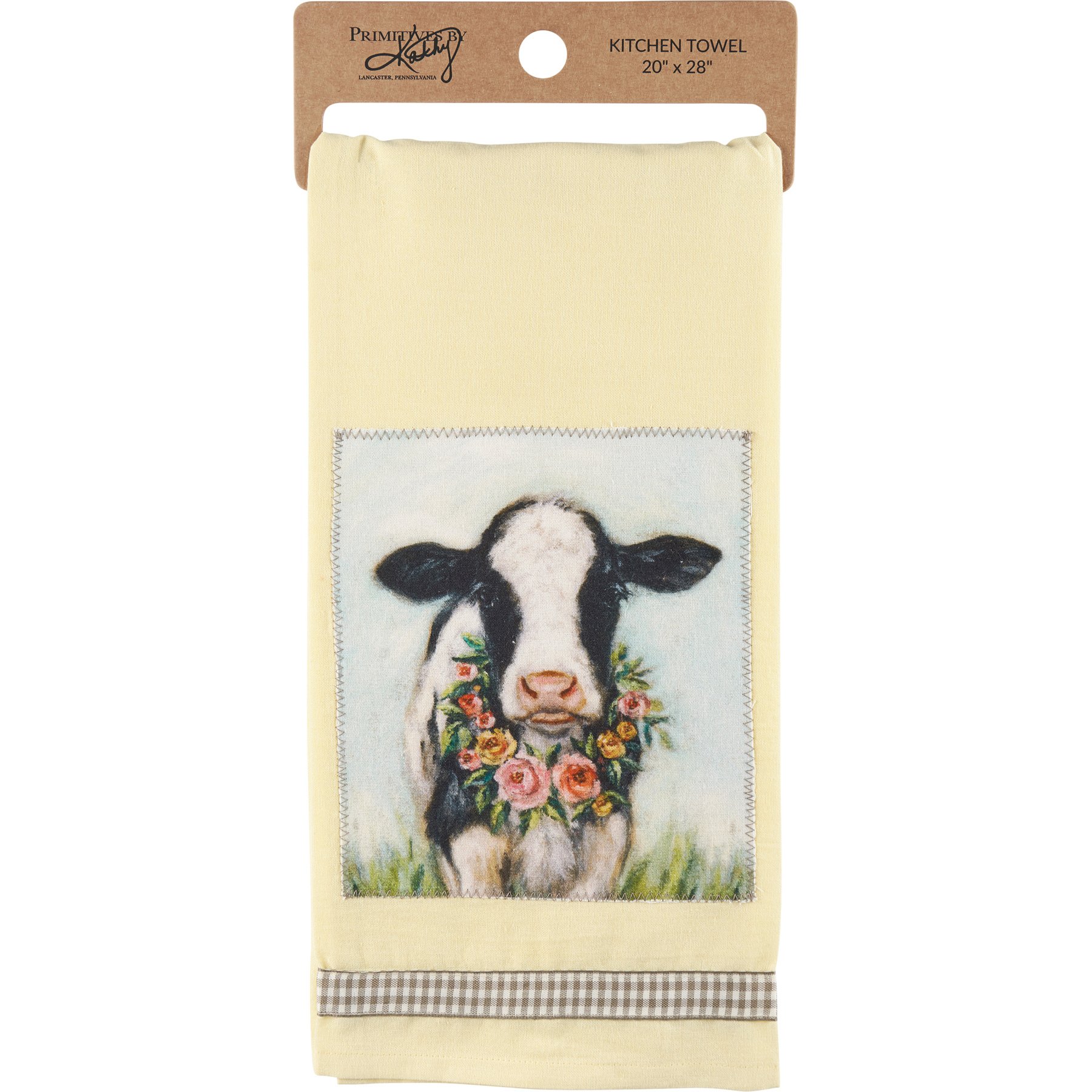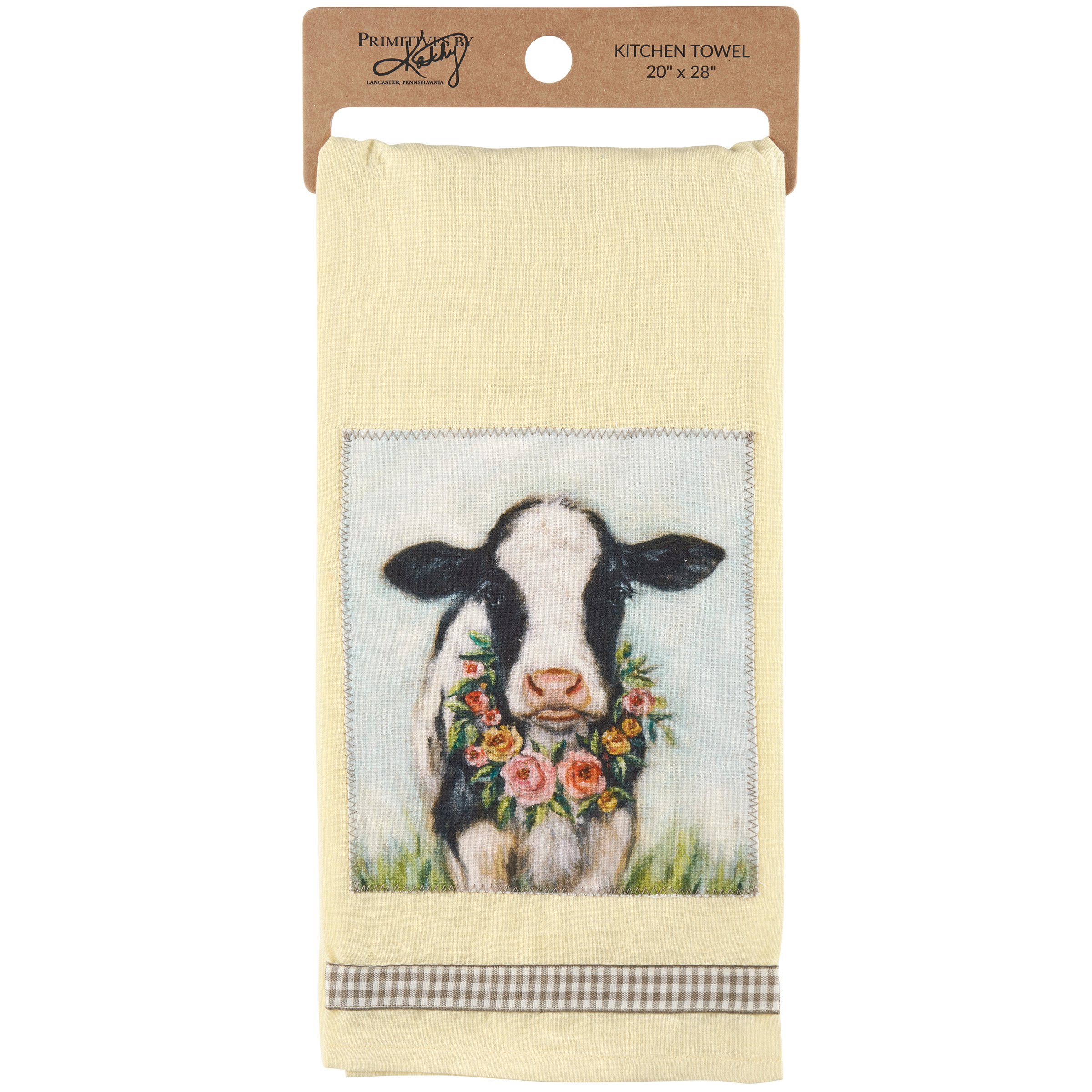 A charming yellow cotton kitchen towel from our Easter & Spring Collection featuring a stitched art panel and gray gingham ribbon. Art panel displays a hand painted design of a cow wearing a wreath of flowers. Design is replicated from original artwork painted onto burlap canvas, giving the art a unique depth and texture. Our Calf And Wreath kitchen towel is machine-washable for convenient cleaning. Packaged on a cardboard hanger with hole to easily hang on rack.